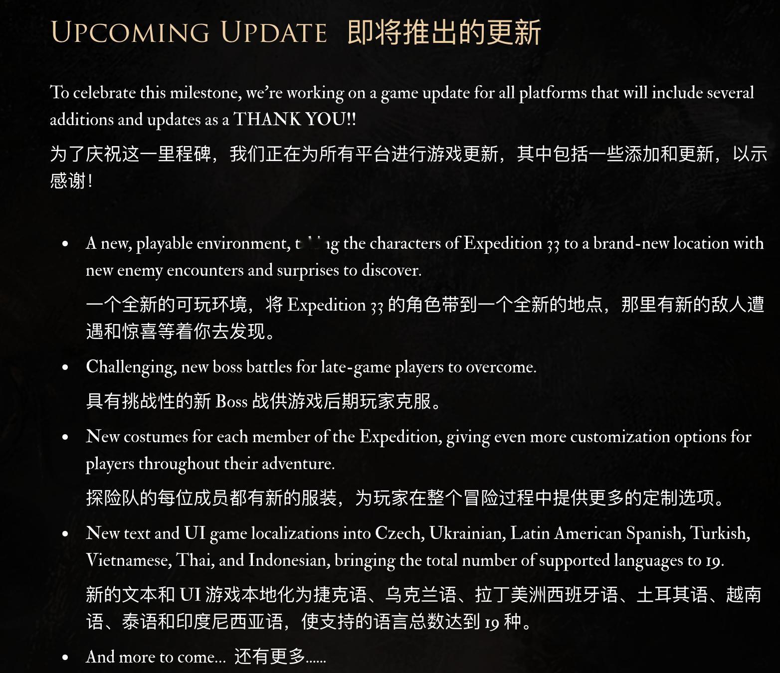 《光与影:33号远征队》官方宣布其游戏的全球销量已突破500万份,并公开贺图来纪念这一里程碑。此外,开发商宣布正在开发大型免费更新以回馈玩家,其中包括全新的可玩区域、后期BOSS战与服装等,具体日期有待官方后续公布。光与影33号远征队