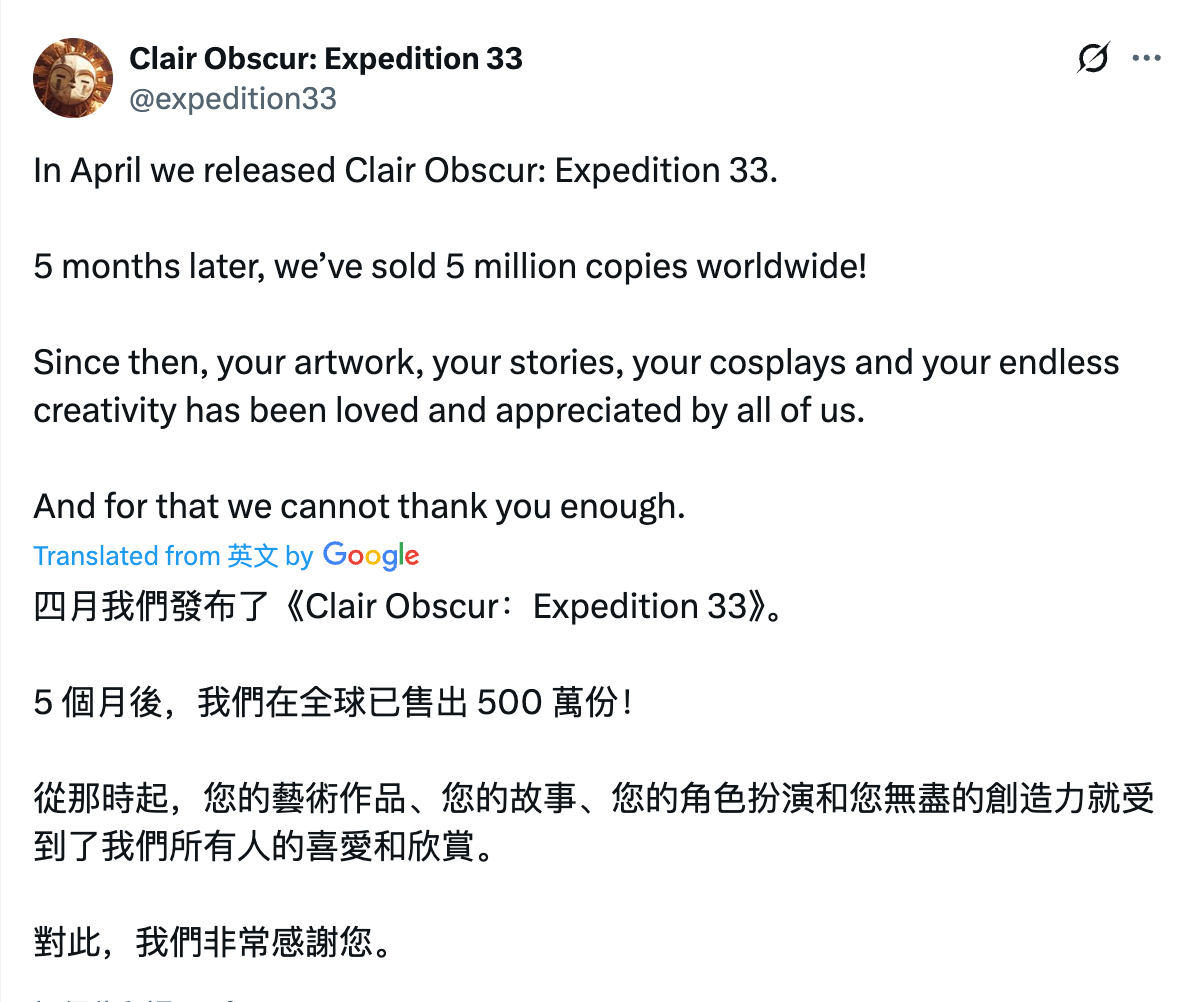 【《33号远征队》销量500万贺图,将有免费大更新回馈玩家】