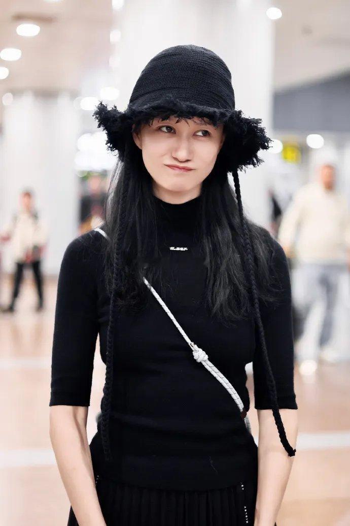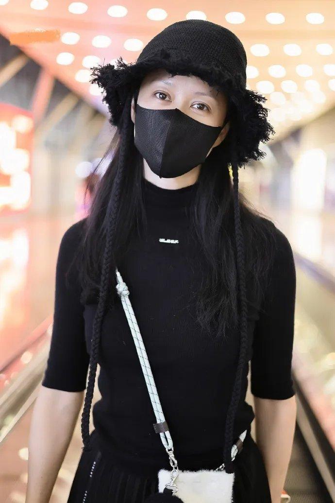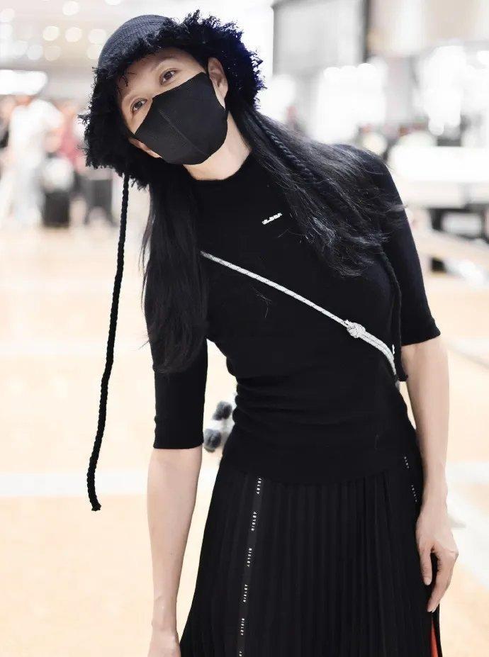 倪虹洁现身北京机场搭配了一身黑色的衣服,看上去真的是很酷。