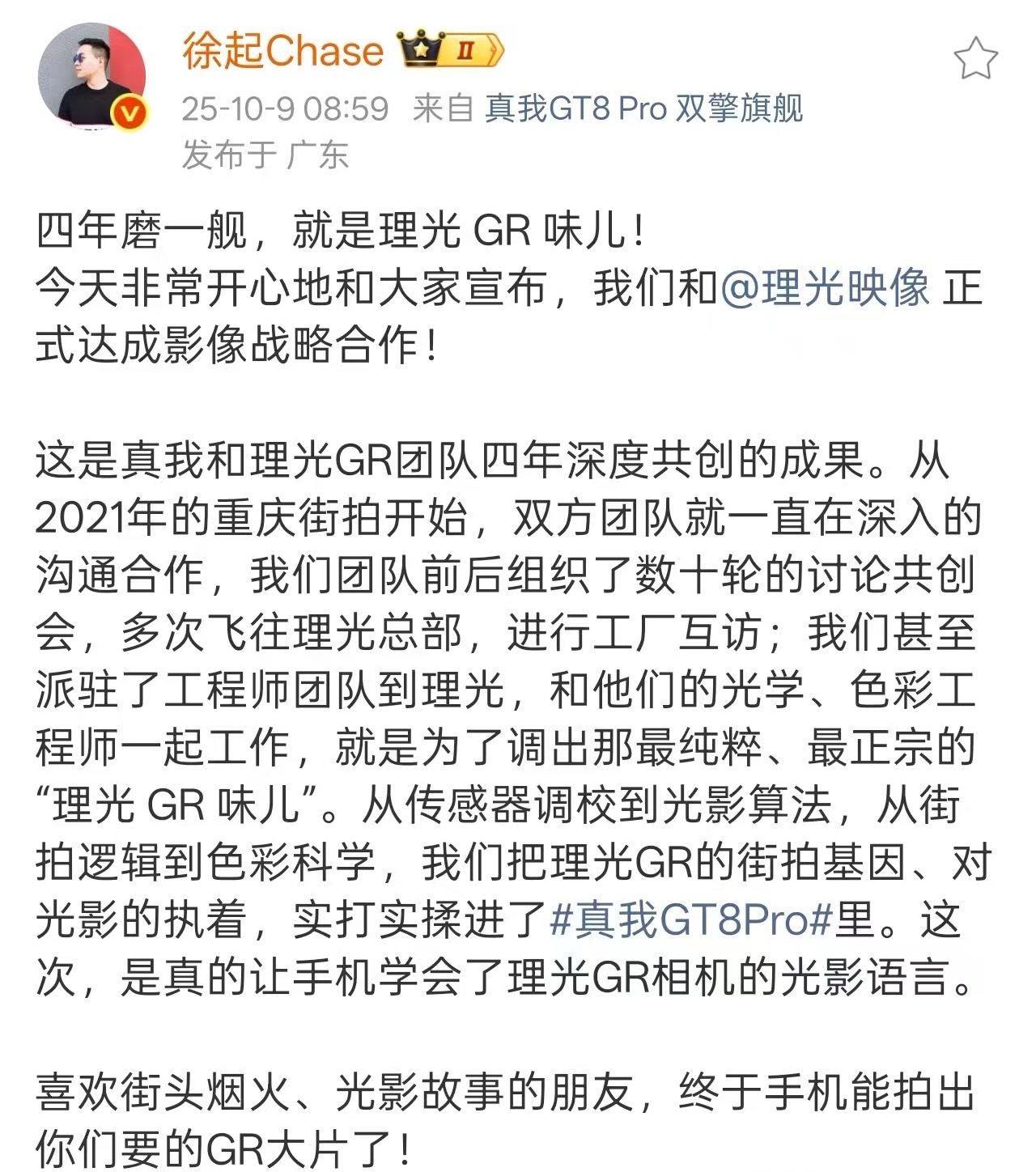 果然猜的没错!真我官宣与理光GR达成影像战略合作,从传感器调校到光影算法,从街拍逻辑到色彩科学等全链路打造理光GR影像系统,[不愧是你]我们坐等真我GT8Pro吧!