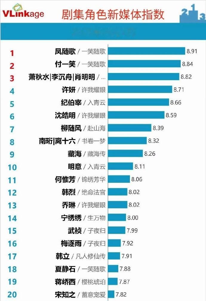 成毅、李沁与登顶的陈哲远组成V榜前三阵容,陈哲远的凤随歌角色功不可没。演员与