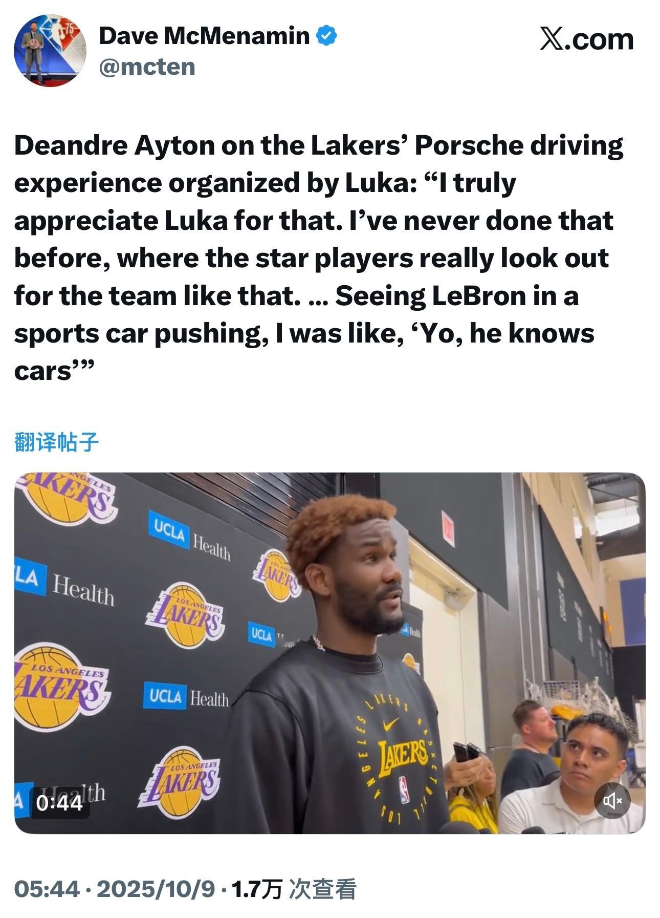 艾顿则认为:“我非常感谢卢卡的安排,我以前从未有过这样的经历,球星会如此关心团队,看到勒布朗开着跑车飞驰,我心想:‘哇,他真懂车。’”