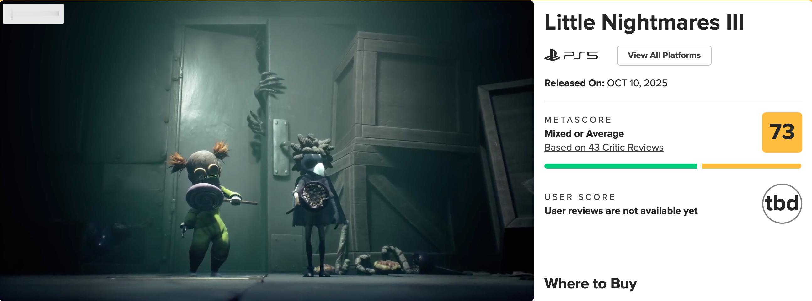 《小小梦魇3》M站媒体评分出炉,目前共43家媒体评测均分为73分。游戏将于10月10日正式发售,登陆Switch/Switch 2、PS4/PS5、XSX|S和PC平台。
