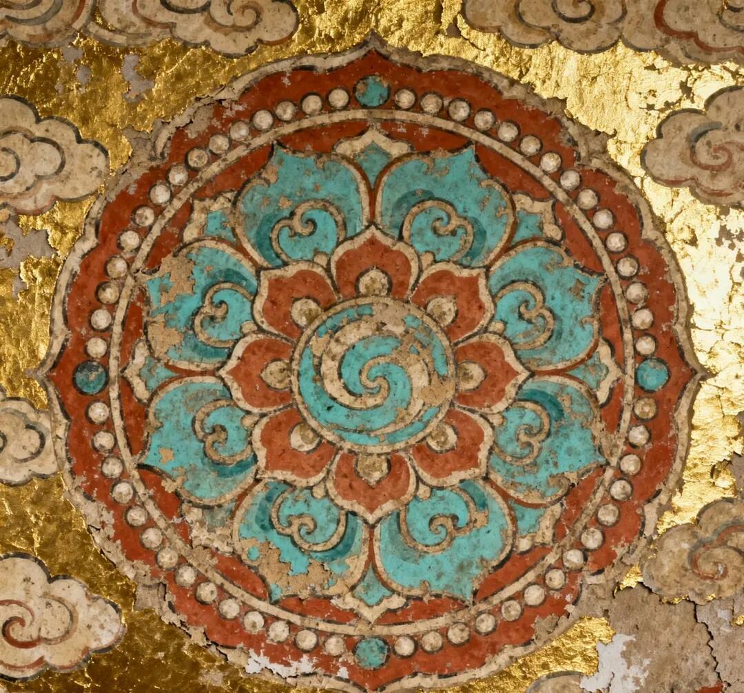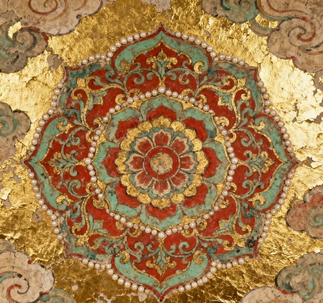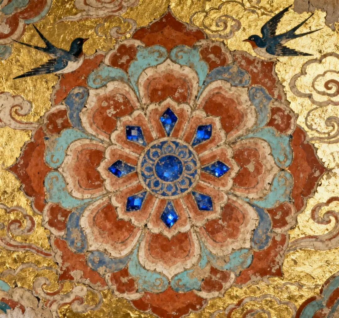 宝相花纹样|唐代宝相花,融合莲花之圣洁、牡丹之华贵、菊花之雅致,以中心对称的放射状花瓣,层层晕染,如宝珠生辉,尽显盛唐气象。