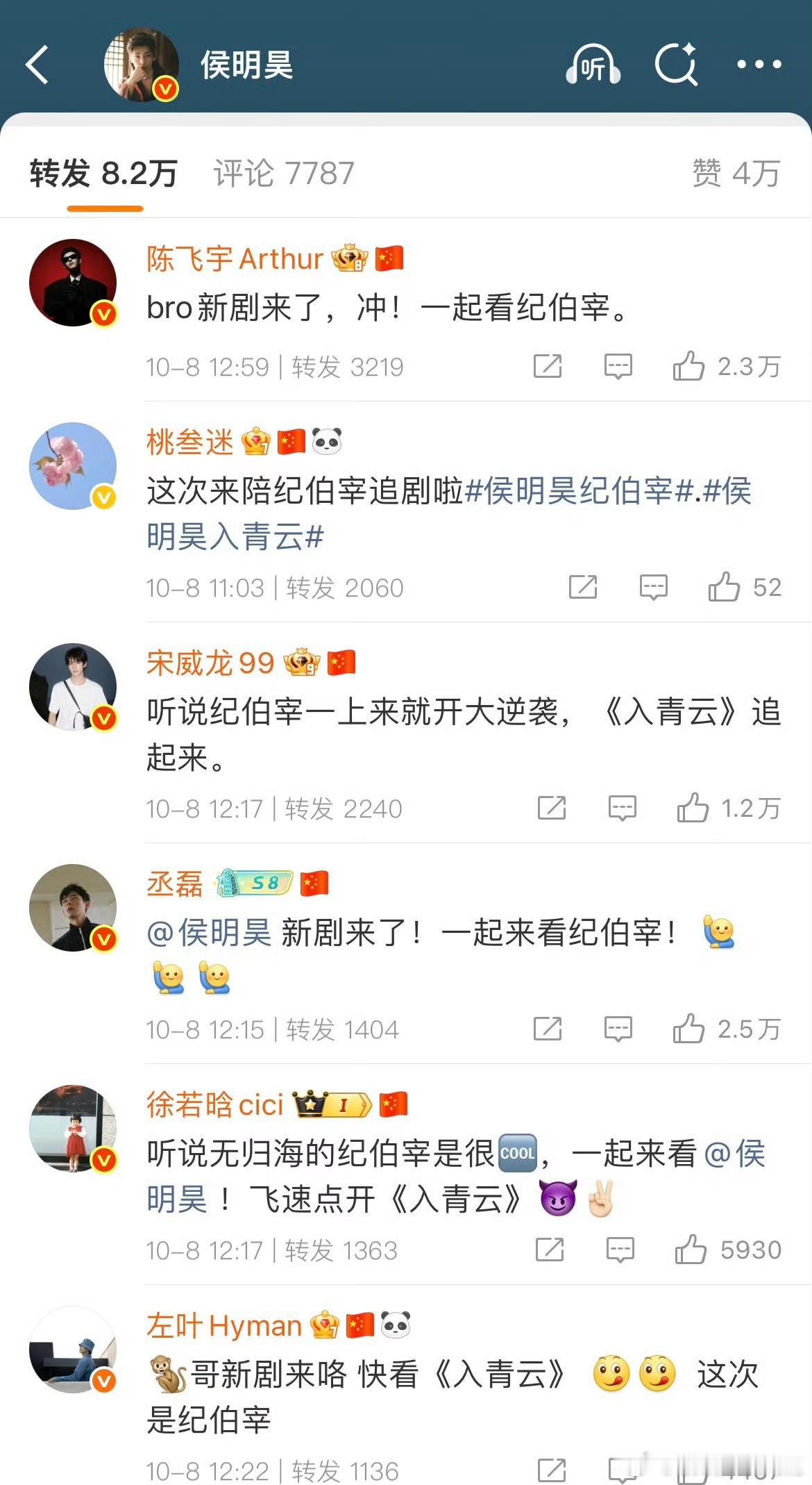 侯明昊出道以来第一次摇人宣传花少CP都来撑场,和卢昱晓这边倪妮张凌赫助力呼应上了~ 虽然《入青云》锁评了,但纪伯宰的美貌和拉扯感我先get了,反复回看太正常,这不亏!