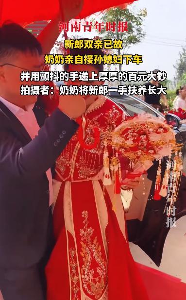 看哭了!10月8日,江苏,一新郎在接亲迎娶新娘时,因为父母都已经去世,这时他的奶奶亲自来接孙媳妇下车,还用双手颤抖着递上了厚厚的一沓钞票,这一幕让网友瞬间破防:这里面沉甸甸的都是奶奶的爱啊! 隔辈亲这个词,我们都不陌生。老人疼孙子孙女,有时候比疼自己孩子还厉害。 这种爱能有多深?有人拿出积蓄,有人付出时间,甚至有人能豁出性命。最近,江苏一场婚礼上的画面,就让我们看到了这种爱最重的样子。 新郎的婚车到了门口,一位头发全白的老奶奶,颤颤巍巍地走到车边。她没多说话,只是用一双抖个不停的手,把一沓厚实的现金,递给了还没下车的新娘。 按理说,“下车钱”这个环节,该是新郎父母出面。但特殊的是,新郎的父母已经过世了。这个前提,让眼前的一幕完全不同。一般的隔辈亲,是老人享受天伦之乐,逗逗孩子,不承担抚养的重担。 但这位奶奶,是硬生生把孙子拉扯大的。她既是奶奶,也当了几十年的父亲和母亲。她不是帮衬,她是孙子唯一的支柱。 所以,今天她站在这里,不是来看热闹的。她是在完成一位母亲该做的事,是来替儿子撑起这个家门。她要亲自把这个仪式走完,让所有人都看到,这个家有人主事。 再看她手里的钱。据摄影师说,这都是奶奶一辈子省下来的。每一分钱,可能都是无数个起早贪黑的日子,是她为了孙子能过得好一点,自己省下的每一顿饭、每一件衣。 新娘接过去的,是一个老人用自己全部的晚年,给孙子换来的一个安稳的开始。 一场婚礼,也是办给亲戚邻里看的。一个父母不在的家庭,很容易招来旁人复杂的眼光,或许是同情,或许是议论。 奶奶的这个举动,就是一份无声的声明。她一句话都没说,但比任何话都有用。她就是用这个最直接的办法告诉所有人:我孙子背后有人,这个新家,有底气,有依靠。她用自己的方式,守住了孙子的体面,也守住了这个家的尊严。 在很多家庭,祖辈给孙辈买车买房,是在孩子本就不错的基础上,再添一把力。但这位奶奶的付出不一样。没有她,就没有这个家。 这个事情最触动人的,就是这份沉甸甸的,被责任扛起来的爱。它已经不只是单纯的疼爱了,它和一份必须完成的任务绑在了一起。 那沓钱有多重?或许,就是一个老人一辈子的重量。 信息来源:《新郎双亲已故,奶奶亲自接孙媳妇下车并用颤抖的手递上厚厚的百元大钞》河南青年时报