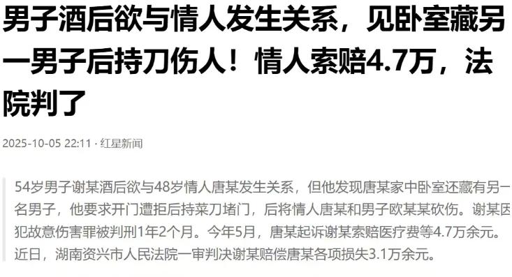 湖南资兴,男子喝了酒,瞒着妻子,去找另外一名女子约会,还想和女子发生事情,结果发现了另一名男子,藏在女子的卧室里,他很生气,跑去厨房拿起一把菜刀,就挥向女子和另一名男子,事后女子要求他赔偿4.7万元。 2024 年 2 月 26 日晚上54 岁的谢某瞒着家里的妻子,揣着几分酒意想去找 48 岁的唐某。两人私下早有往来,谢某仗着自己偶尔给唐某买点东西,便觉得对方该对自己言听计从。 出门前他给唐某打了个电话,听筒里隐约飘来的陌生男声,让本就酒后情绪上头的他瞬间起了疑心,脚步不由得加快了几分,步行赶往唐某的住处。 晚上 9 点多,谢某推开唐某家的门,客厅里的气氛透着古怪。唐某眼神闪躲,说话也支支吾吾,他扫了一眼紧闭的卧室门,当即断定里面藏了人,强硬地要求开门。唐某死死拦着不肯,两人在客厅吵得面红耳赤,争执声撞在墙上又弹回来,却没能逼出卧室里的人。 这场对峙从深夜拖到了 27 日凌晨 1 点,卧室里的欧某某始终没有露面。谢某的怒火跟着时间一起发酵,酒劲混着猜忌让他彻底失去了耐心。 他转身搬来凳子死死抵在大门内侧,断了唐某求助的念头,接着冲进厨房抄起一把锃亮的菜刀,攥在手里来回踱步,隔着卧室门不住地威胁。之后的几个小时,他就坐在客厅里,一边往嘴里灌着剩下的酒,一边死死盯着卧室门,空气里弥漫着酒精和危险的味道。 凌晨 4 点多,唐某实在熬不住了,趁着谢某喝酒的间隙,偷偷给堂哥樊某某发了求救信息。半小时后,樊某某夫妇赶到门外,唐某听到熟悉的声音,不顾谢某的阻拦就要去开门。没等她碰到门把手,谢某就红着眼扑了上来,菜刀朝着她的右手和右侧头面部狠狠砍去,鲜血瞬间涌了出来。 卧室里的欧某某听见惨叫声,猛地推开门冲了出来,刚踏出房门就被谢某砍中头面部。好在欧某某年轻些,忍着剧痛一把将谢某扑倒在地。此时樊某某已经破门而入,冲上去夺下菜刀,和欧某某一起将谢某死死按在地上,樊某某的妻子赶紧掏出手机报了警。 清晨 5 点,唐某被紧急送进资兴市的医院,医生检查后发现伤势远比看着严重:开放性右拇指指骨骨折、手部指伸肌腱损伤,更要命的是开放性颅骨骨折和头皮裂伤,面部也留下了深深的伤口。 她在医院住了 14 天,出院后连简单的握笔都费劲。2024 年 7 月,唐某委托鉴定机构做了评估,结果显示她需要 90 天的误工休养,还得 30 天的专人护理和营养补充。 谢某的下场来得很快,2 月 27 日当天就被警方抓获,3 月被刑事拘留,没过多久就被批准逮捕。6 月 17 日,法院认定他的行为构成故意伤害罪,考虑到他持械伤人、堵门威胁的情节,判了他 1 年 2 个月的有期徒刑。 本以为坐牢就能了结,没想到 2025 年 5 月,唐某又拿着一堆票据和鉴定报告把谢某告上了法院,索赔医疗费、误工费等共计 4.7 万余元。 法院逐一核对了医疗单据、误工证明和鉴定报告,最终认定合理损失为 3.1 万余元,判决谢某赔偿这笔钱。一场婚外情,让谢某丢了自由又赔了钱,唐某落得满身伤痕,欧某某也平白受了伤。 对此,你们怎么看?欢迎留言评论~