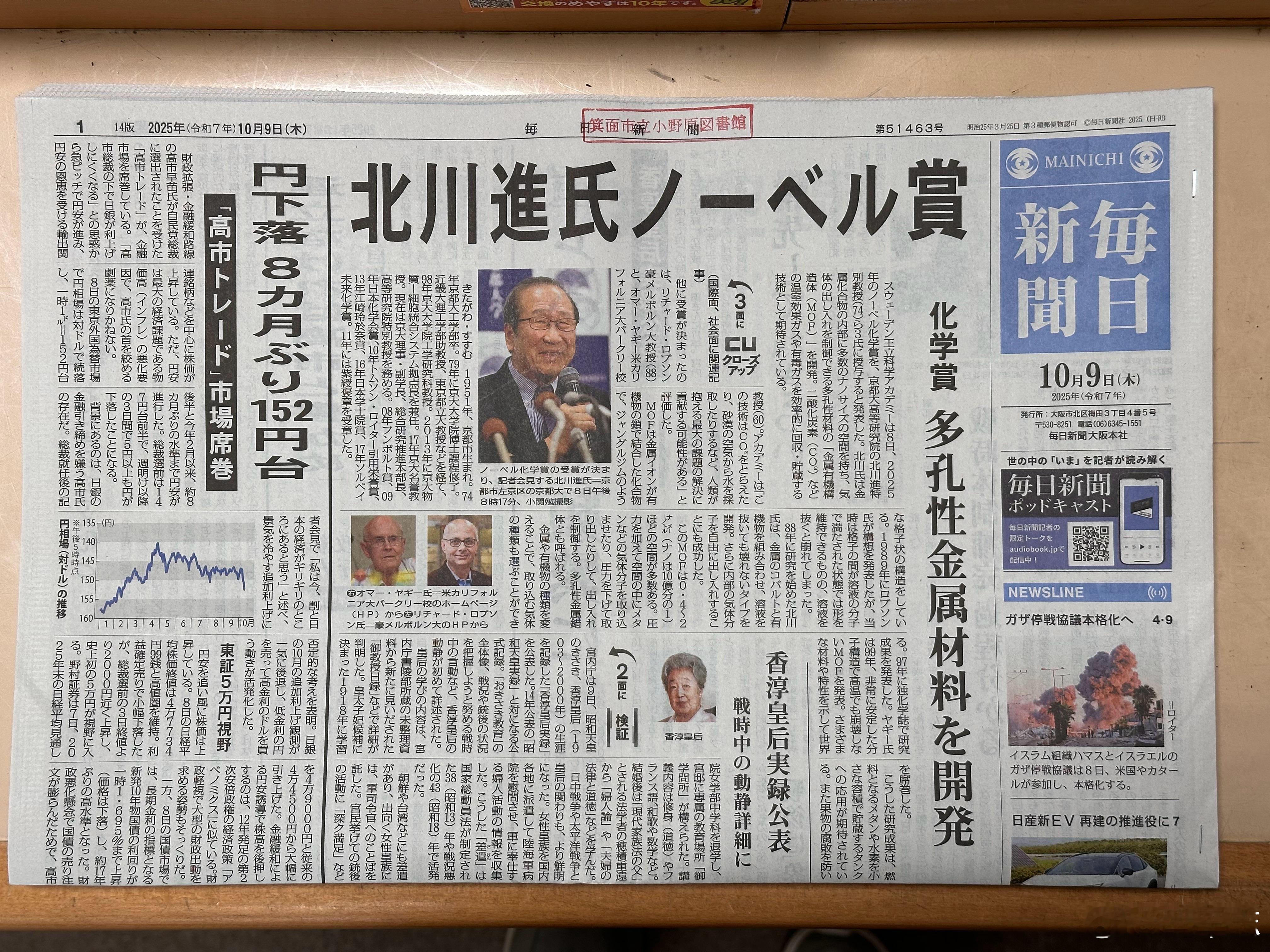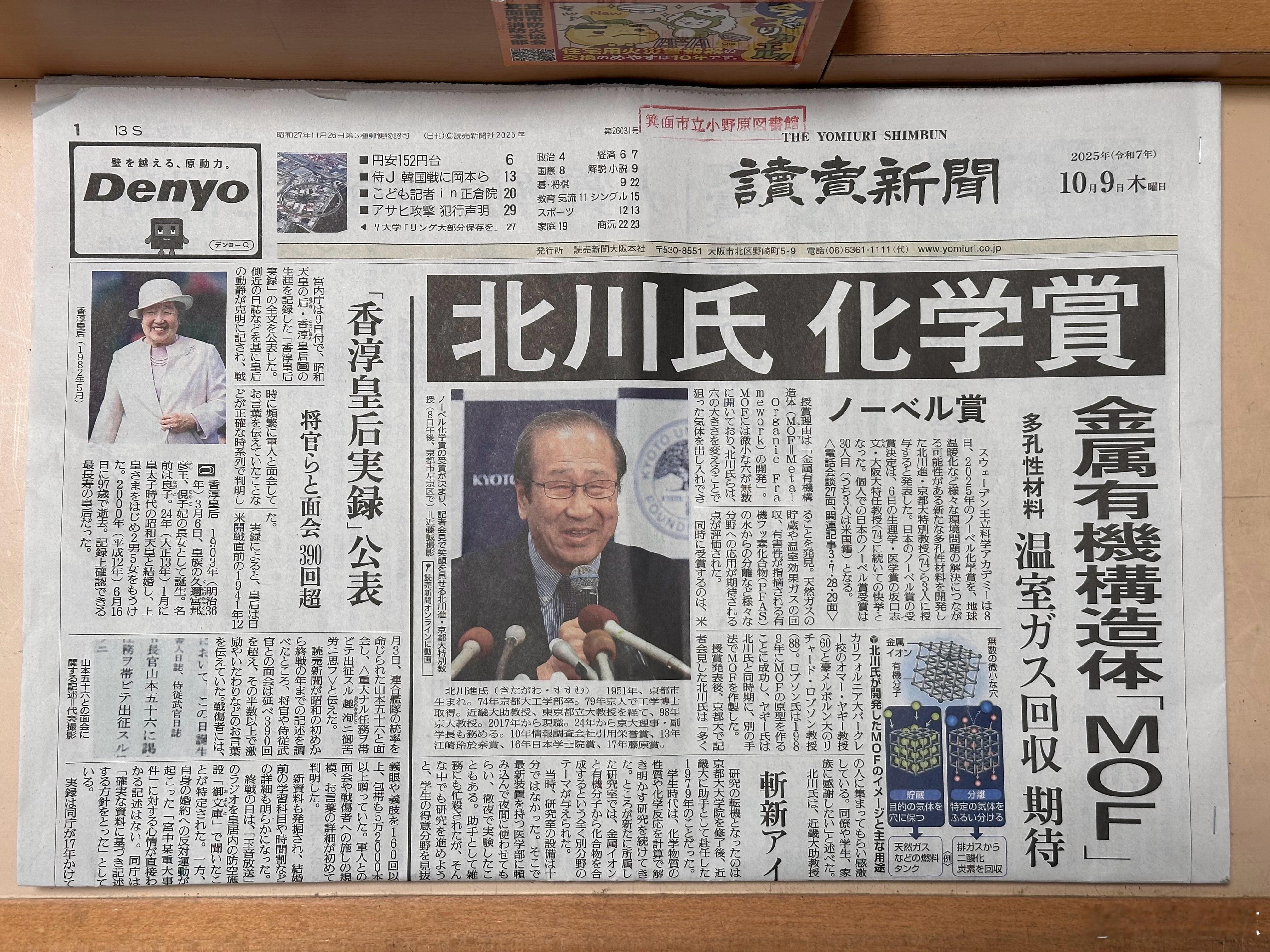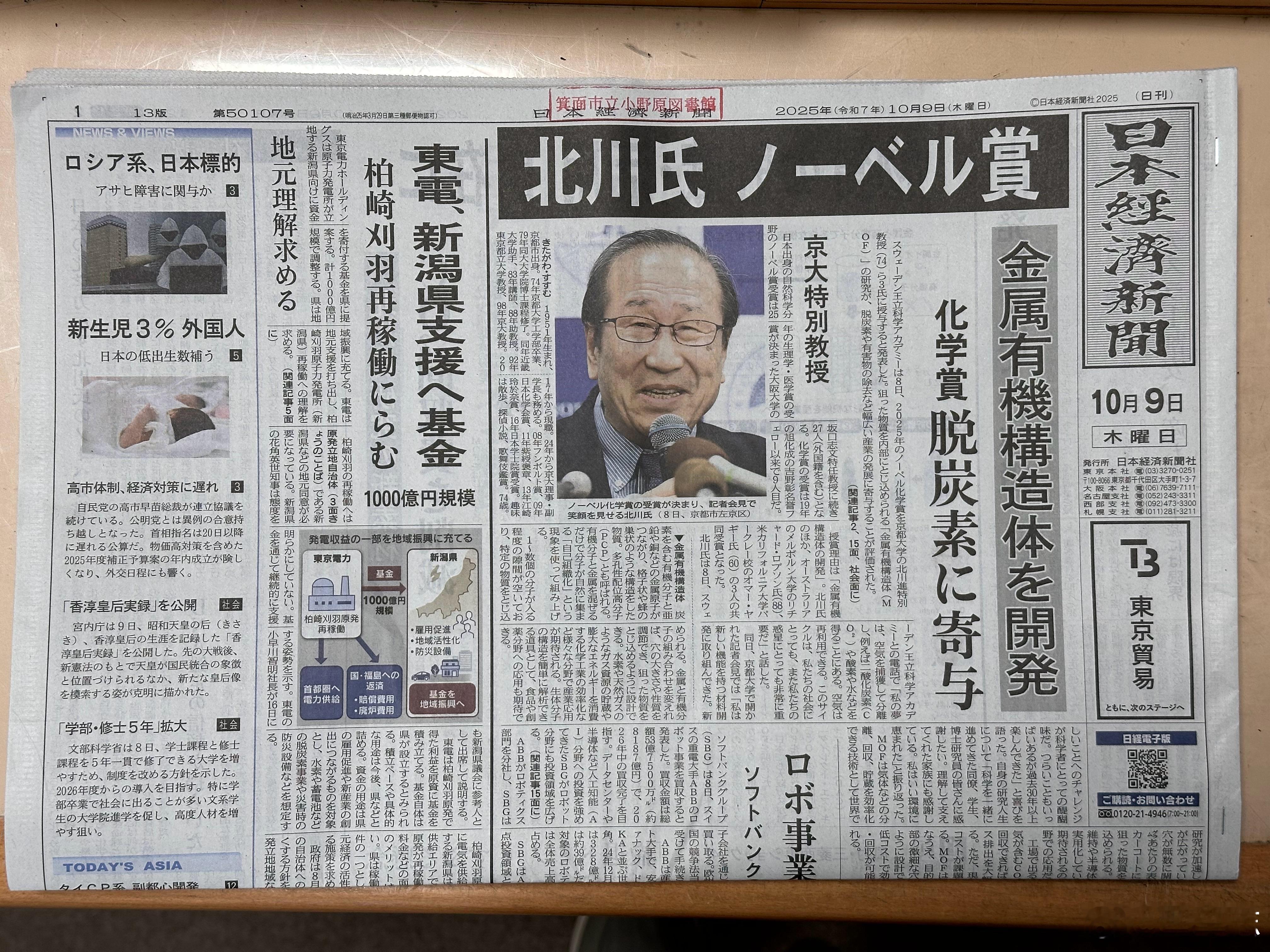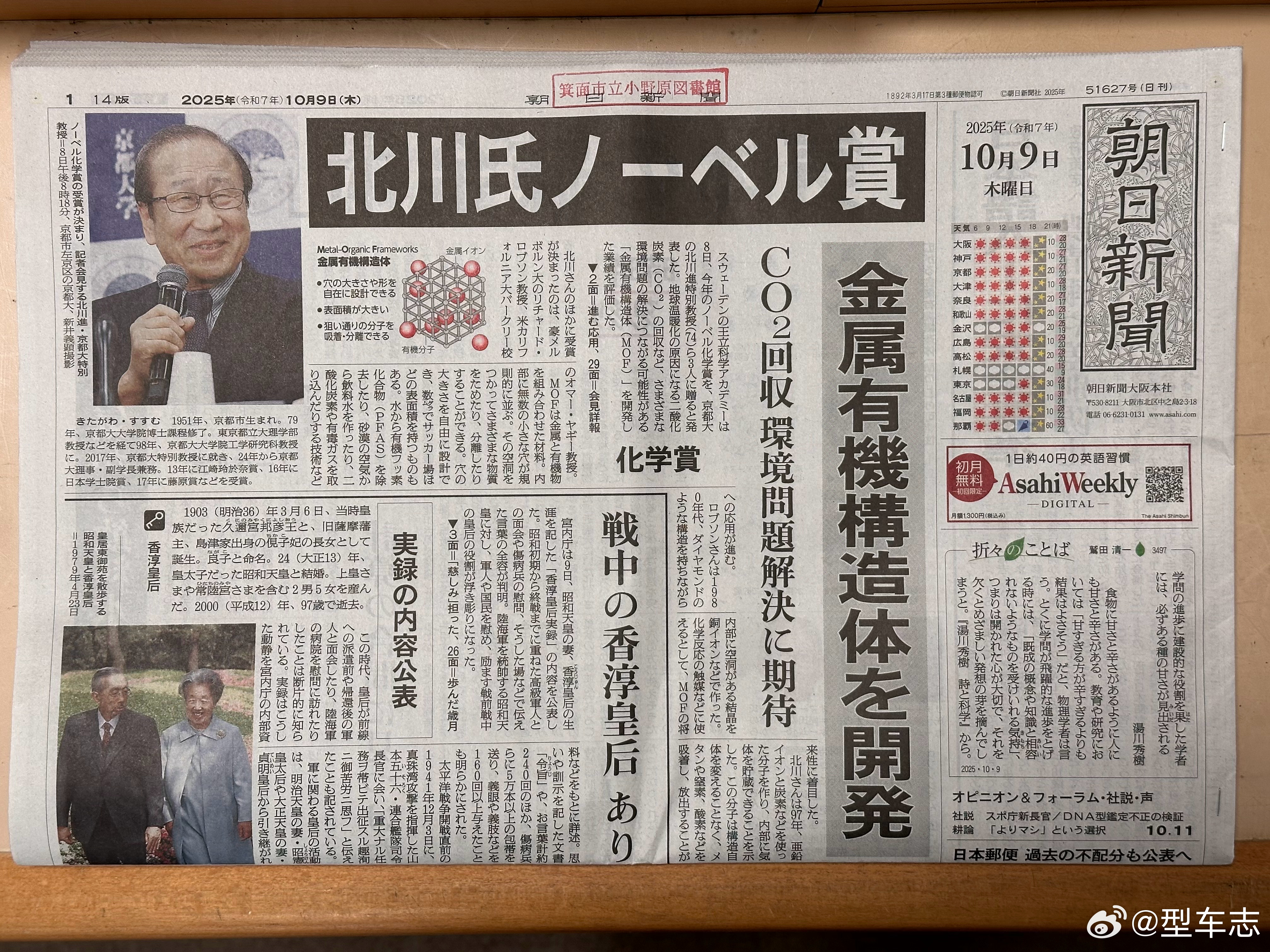 2025诺贝尔化学奖揭晓 今天日本各大报纸头版头条,几乎清一色是京都大学名誉教授北川进获得诺贝尔化学奖。他的获奖研究是金属有机框架(MOF),一种像分子海绵一样的多孔材料,可用于吸附二氧化碳、储存氢气、净化空气等,是未来能源与环境领域的关键技术。至此,日本在自然科学领域(物理、化学、生物医学)已拿下30项诺贝尔奖。
