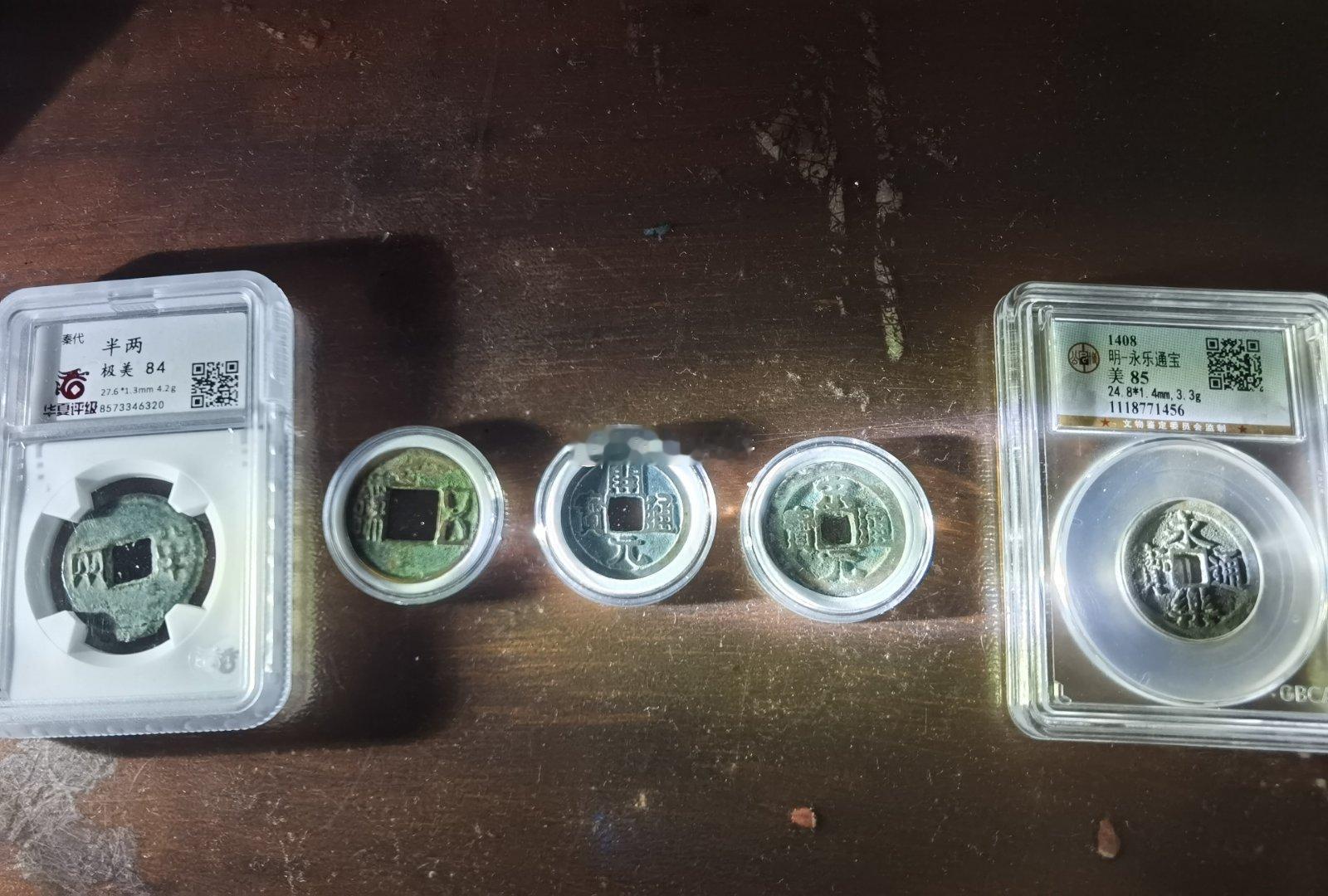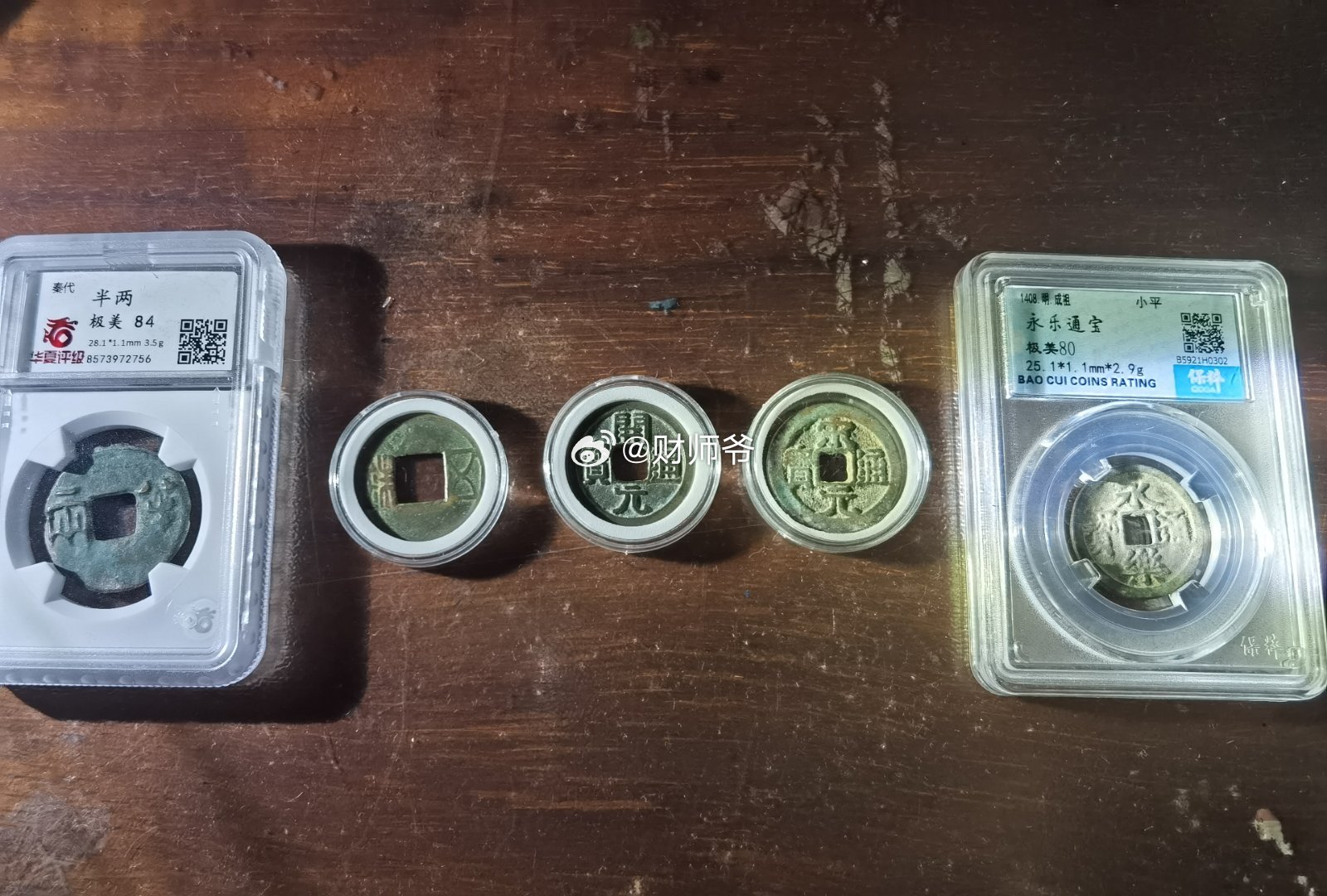 其中【始皇半两】重3.5克~4.7克,字迹清晰(4.7克大半两不是边缘缺损,而是铸造时的流铜现象);汉五铢(上林三官版)、唐开元、宋宋元、明永乐均品相上佳。