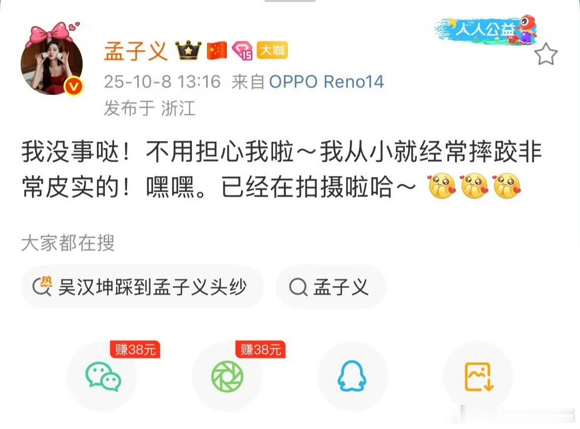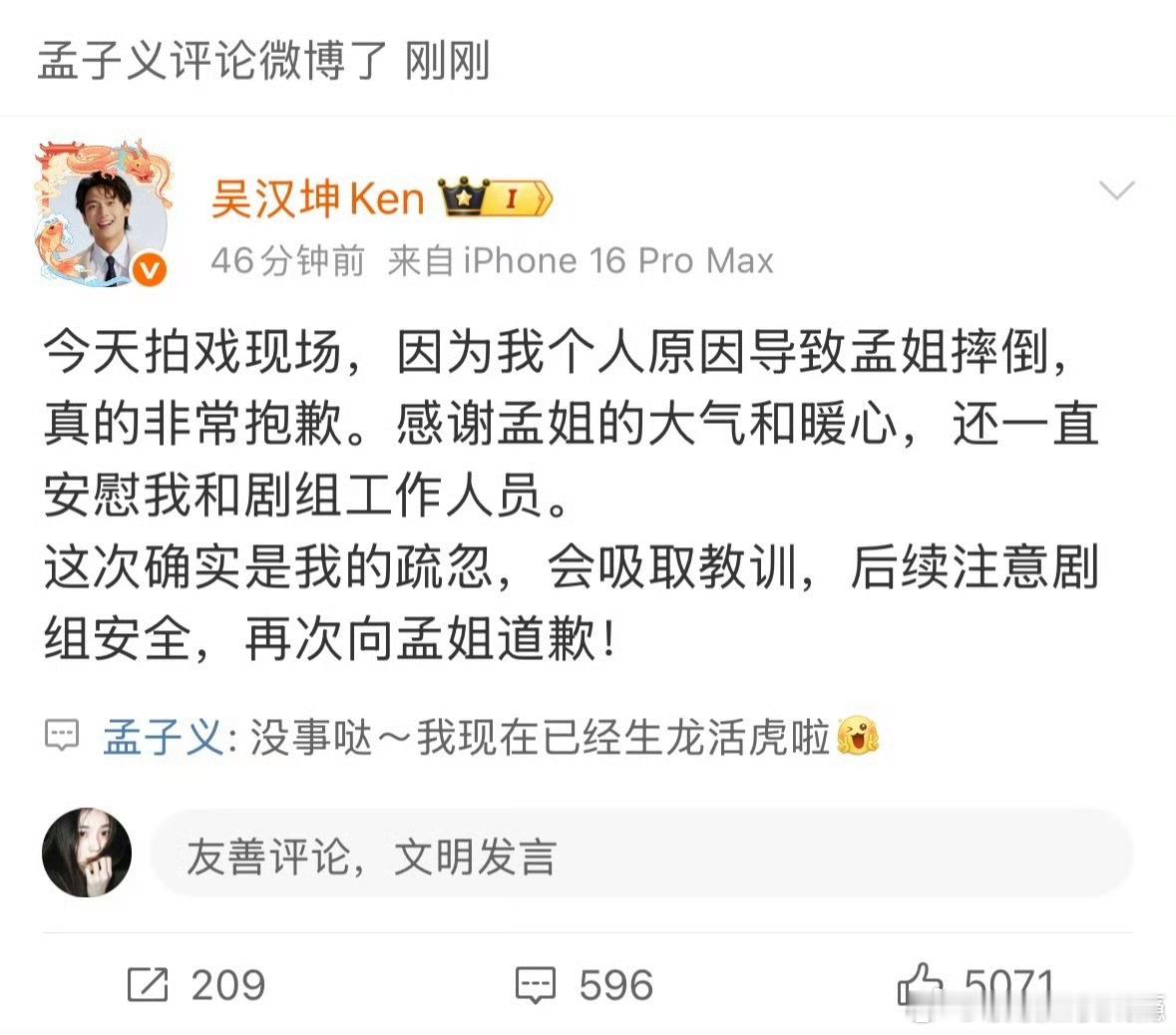 孟子义太体面了摔倒后第一反应是安抚同事,上线还去同事微博下操心,这心善程度绝了~