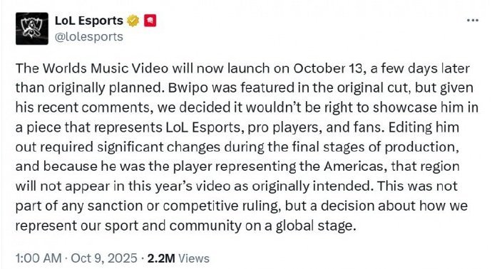 LOLesports官方宣布公告!表示S15主题曲MV将推迟至10月13日发布,主因是FLY上单选手Bwipo原本出现在最初版本中,但鉴于他最近的言论,官方认为在本次主题曲MV展示他并不合适。并且由于他是代表美洲赛区的选手,今年的MV中美洲赛区将不会出现。