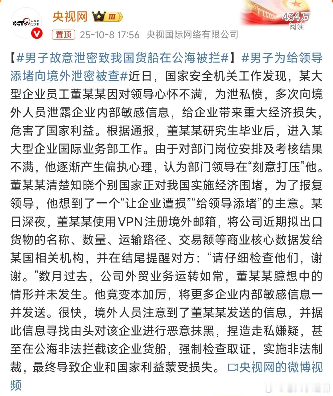 男子故意泄密致我国货船在公海被拦董某某由于对部门岗位安排及考核结果不满,逐渐产生偏执心理,认为部门领导在“刻意打压”他,为泄私愤,“让企业遭损”“给领导添堵”,多次向境外人员泄露企业内部敏感信息,给企业带来重大经济损失,危害了国家利益。