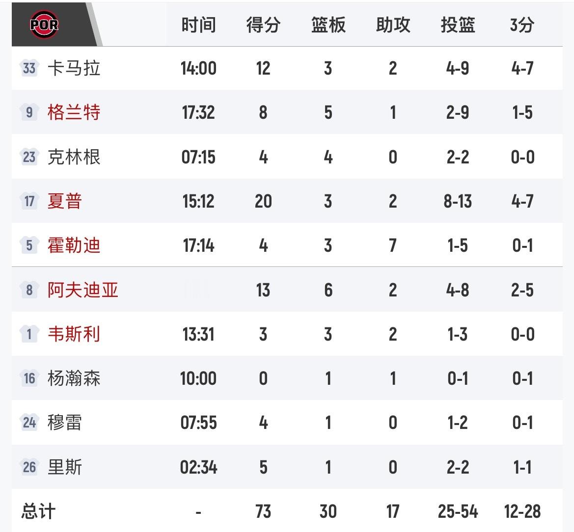 开拓者半场火力全开,得到了73分。