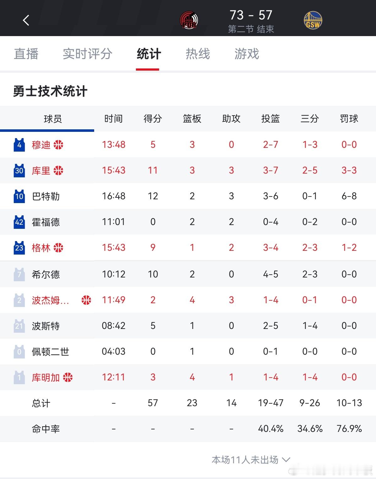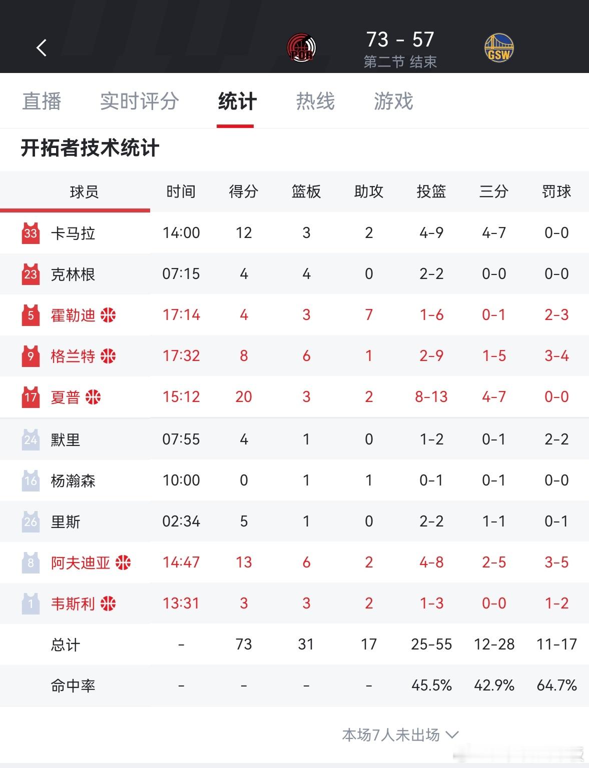 半场开拓者73-57领先勇士!夏普20分,阿弗迪亚13分,杨瀚森目前0分1板1助