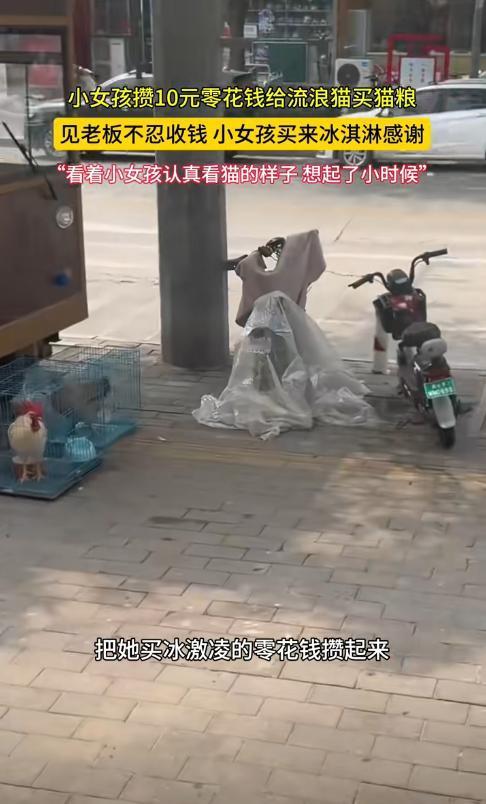 河北近日,小女孩攒了10元零花钱去给流浪猫买猫粮,老板得知女孩的举动后说:“猫粮