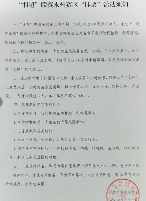 永州市足球协会官方公众号上发布的“湘超联赛”永州赛区“相亲票”活动须知(下称“须知”)显示,“打卡湘超·缘定永州”相亲票实行实名预约制,免费赠送,通过“一码游永州”微信小程序提交申请。组委会将在公证处监督下随机抽取并“天选配对”,确保流程公平、公正、公开。须知要求,一经报名参与即视为自愿接受活动安排,“请坚持到底保持礼貌,不得中途退场或临时安排‘演员’顶替。”