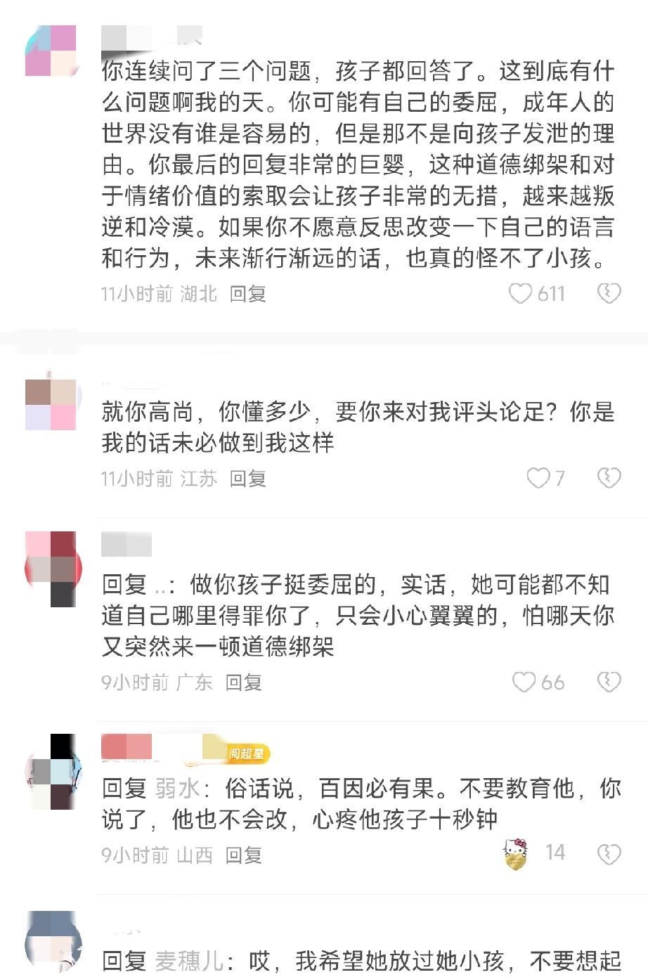 一位妈妈深夜发了一张聊天记录截图,引起网友的激烈讨论。 聊天记录中是她和女儿的对话,她给女儿发了信息一连问了几个问题,问女儿和儿子乖不乖,然后问女儿有没有买月饼,再问女儿国庆节有没有出去玩,什么时候上学。 看得出这妈妈是想关心一下孩子。 女儿也回复了妈妈的信息,“去了买了,明天”,不过看了一下恢复的时间,是第二天早上回的。 白天没有动静,到了晚上,这位妈妈突然给孩子回复了一条信息,“孩子对不起了,是你妈多嘴了,算了吧,12 年来,我哪怕自己不吃不喝,我想要把最好的给你,最后换来你这种态度,一次次让我心寒,以后你就当你妈我死了。” 这条信息的内容充斥着一种很悲观以及埋怨的情绪。 网友看了后,纷纷评论。 有人说,你连续问了孩子几个问题,孩子都回答了,这到底有什么问题? 有人说,想多了其实,有点玻璃心了。 有人说,孩子最大的财富是她觉得自己的老妈可以给她温暖,在她遇到任何困难的时候,只要一看到你,或者一跟你说到话内心就会平和,所以永远不要给孩子传递负能量。 在小编看来,有可能这位妈妈觉得孩子回复得太简单了,寥寥数字,显得很不热情,让她感觉孩子不太想搭理她,所以她觉得自己热脸贴冷屁股,很委屈,才说出了最后那段话吧。 网友说得好,孩子还小,话说太重了,而且跟孩子沟通尽量电话聊天,少打字。文字是最容易产生精神垃圾的渠道。有条件多去看,多带身边,真心付出一定会让他们看到的。 对此,大家怎么看?