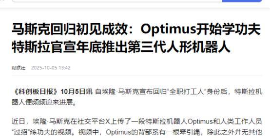 马克斯正式宣布了 10月4日,马斯克在网上晒出了特斯拉机器人Optimus与特斯拉工作人员“练功夫”的视频,并表示“很有趣!”视频中展示了特斯拉机器人相当灵活的动作能力,能够模仿人类的各种动作,并且能够进行格挡。 马斯克特意强调,这可不是遥控操作,而是Optimus自己用AI在“思考”动作。 要说Optimus的野心远不止于表演武术。其背部搭载的45磅负载能力,足以搬运汽车零部件;26个微型执行器构成的手指,能完成捏鸡蛋、拧螺丝等精细操作。这意味着它既能在工厂里搬重物,又能在实验室里做精密实验,简直是个全能选手。 其实Optimus能有这样的本事,背后离不开中国供应商的支持。比如拓普集团,作为Optimus执行器总成的独家供应商,给Optimus提供了关键的关节模块。三花智控也没闲着,给Optimus定制了带液冷系统的关节模组,就算Optimus连续做100个深蹲,关节也不会过热。 不过Optimus的量产之路并不顺利,原本计划2025年生产5000台,结果因为技术难题,实际产量只有几百台。问题出在哪儿呢?一是关节电机容易过热,二是灵巧手的负载能力还不够,三是电池续航时间太短。特斯拉不得不暂停部分零部件采购,重新优化设计。 但马斯克并没有放弃,他表示,2026年Optimus将进入大规模量产阶段,目标年产5万台。为了实现这个目标,特斯拉已经开始在墨西哥建厂,让供应商离得更近,交货更快。三花智控就在墨西哥建了工厂,把交货时间从20天缩短到5天。 除了工业场景,Optimus还打算进军家庭服务领域。特斯拉计划在2025年底前,把几百台NEO Gamma机器人送到用户家里做测试。这些机器人能擦桌子、整理衣物,甚至帮忙照顾老人。要是测试顺利,未来普通人也能买一台回家当“管家”。 当然,Optimus也面临着不少挑战。比如,它的成本还是太高,一台Optimus的生产成本可能超过2万美元。不过马斯克有信心,随着量产规模扩大,成本会降下来。他甚至预测,到2040年,人形机器人的数量可能会超过人类。 不管怎么说,Optimus的出现,让我们看到了机器人技术的巨大进步。从只会搬东西的机械臂,到能打拳、做家务的人形机器人,科技的发展速度真是让人惊叹。说不定过不了多久,Optimus就会走进我们的生活,成为我们的好帮手呢! 来源:财联社 【马斯克回归初见成效:Optimus开始学功夫特斯拉官宣年底推出第三代人形机器人】