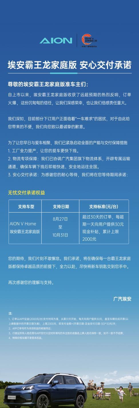 【埃安霸王龙家庭版首月交付破6000台,“安心交付”晚交付补现金】自8月底上市以来,埃安霸王龙家庭版凭订单超预期,首月交付破6000台。热销之下,广汽埃安也在全力提升产能,力保每位用户都能如期提车。广汽埃安发布了霸王龙家庭版“安心交付”政策: