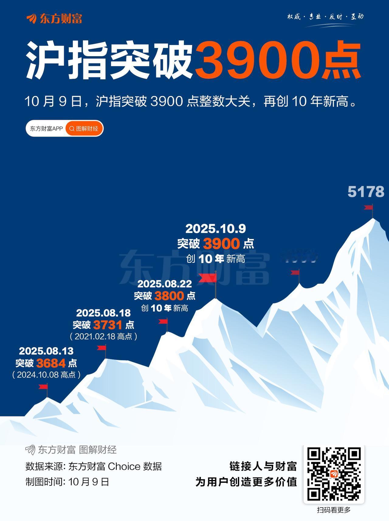 A股午评:沪指突破3900点!刷新十年新高! …………………………….. “十一”长假后的首个交易日,A股迎来了里程碑时刻。10月9日,A股三大指数高开高走,沪指突破3900点整数大关,刷新2015年8月以来新高。 A股三大指数早盘集体上涨,截至午间收盘,沪指上涨1.24%,报3931.07点;深成指上涨1.75%,报13763.88点;创业板指上涨1.77%,报3295.58点;科创50指数上涨5.59%,报1578.88点;北证50指数上涨0.25%,报1532.43点。 沪深京三市半日成交额17269亿元,较上日放量3571亿元。 …………………………………. 板块题材方面,有色金属、黄金、可控核聚变、半导体、风电设备、钢铁板块涨幅居前; 旅游、影视院线、白酒、房地产、猪肉板块跌幅居前。 盘面上,受国际金价大涨影响,有色金属、贵金属板块集体大涨,四川黄金、江西铜业、白银有色等近10股涨停。 可控核聚变板块全线爆发,国光电气20cm涨停,融发核电、合锻智能、浙富控股等10余股封板。 半导体板块延续强势,华虹公司、灿芯股份双双20cm涨停创出历史新高,中微公司、芯原股份、中科飞测等多股同样刷新历史高位。 影视院线、旅游、白酒等传统消费板块表现落后,横店影视、中国电影、博纳影业盘中跌停,凯撒旅业、西域旅游、山西汾酒、泸州老窖纷纷下挫。 …………………………………….. 国庆中秋长假期间(10月1日至10月8日),国际金价大幅度上涨。截至10月8日21时,伦敦金现货盘中突破4000美元/盎司,再创历史新高,最高报价4049.64美元/盎司,假期期间累计上涨4.72%,COMEX黄金最高报价4072美元/盎司,累计上涨4.74%。 全球央行的购金热潮仍在持续。 世界黄金协会的数据显示,2025年以来,全球央行黄金净购买量连续多个季度保持高位。协会发布的《2025年全球央行黄金储备调查》进一步显示,95%的受访央行预计未来12个月内全球央行黄金储备将进一步增加。 我国央行也在持续购买黄金,国家外汇管理局日前公布的数据显示,截至2025年9月末,央行黄金储备升至7406万盎司,较前月增加4万盎司,实现连续第11个月增持。 …………………………………….. 国庆中秋假期全球主要股指和商品价格普遍上涨,其中日本股市、国际铜价涨幅最大,港股先涨后跌,涨幅较小。 美国政府关门扰动、未来降息和衰退的预期使得全球投资者对美元信用和美国主权债务的担忧进一步上升,这推动了金银等贵金属和比特币价格进一步走高。 ………………………………………. 新资金来了! 10月9日当天共计有23只基金同日开启发售,定档10月份发行的新基金数量接近70只,其中不乏一些绩优基金经理挂帅的主动权益基金。 从新发基金类型来看,主动权益基金、指数基金、含权债基成为发行主力,有望为权益市场持续带来增量资金。 ……………………………………. 上午A股加速突破,主要有两大原因: 一是融资盘加速回补可能是主因,节前最后一个交易日,两市融资余额减少近338亿元; 二是节后外围市场普遍造好,人工智能爆款不断,有色金属迭创新高,给市场提供了炒作的土壤。 ………………………………