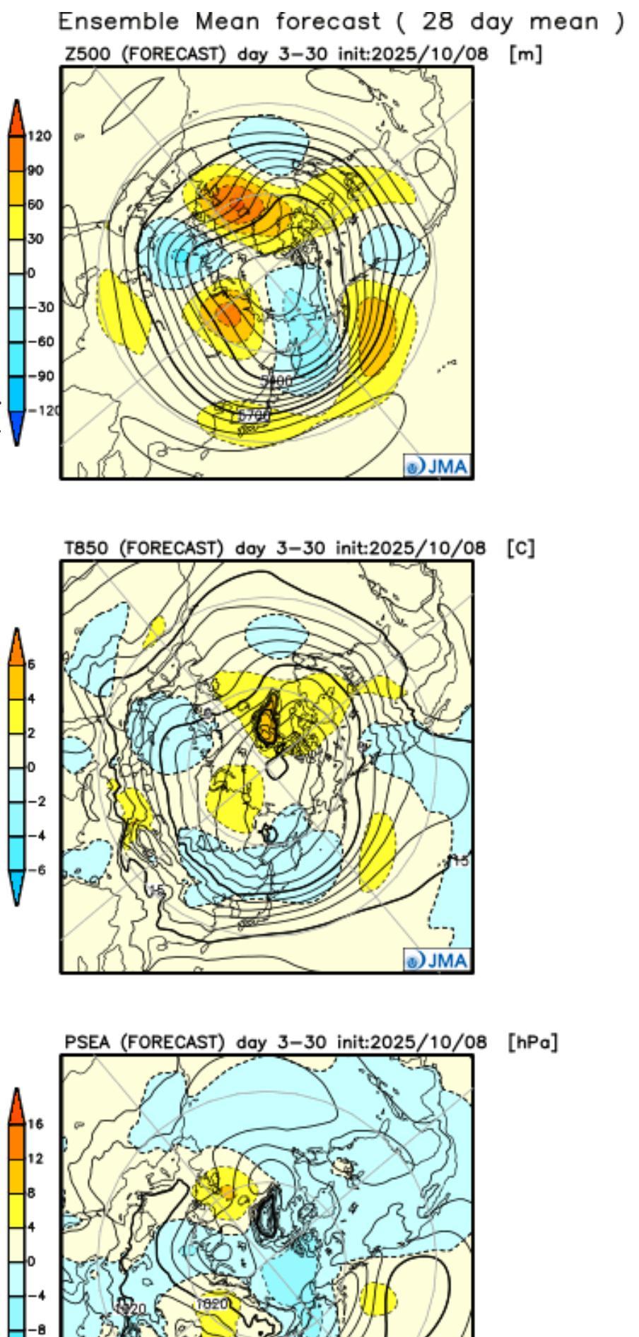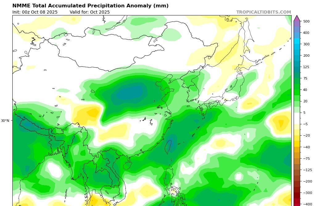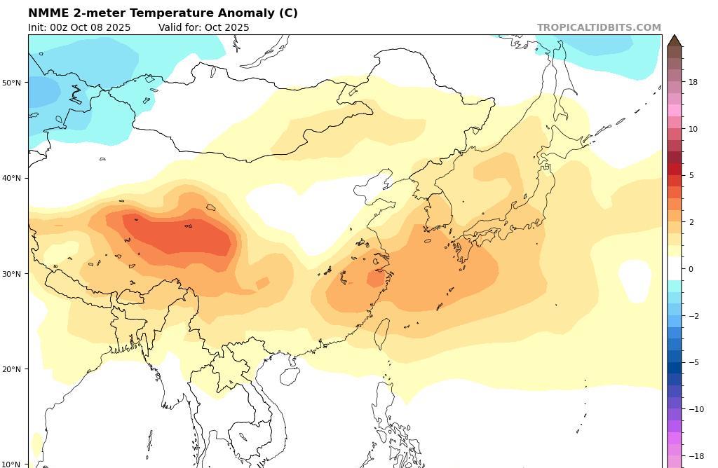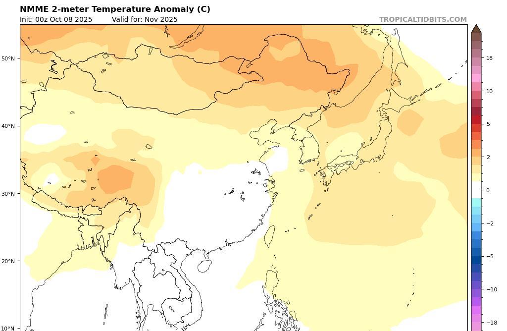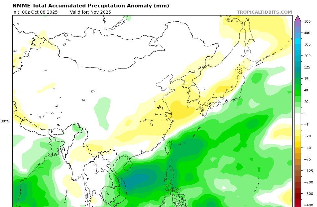 tcc最新一报仍然给出西南西北地区东部至华北黄淮等地降水偏多的信号,不过偏多幅度较上一报下降。气温距平方面,北低南高,东北华北至华中北部显著偏低。此外北美多家集合模式nmme新报也已经出炉:10月份西北华北黄淮等地多雨信号趋势突出, 青藏高原以及华东地区显著偏暖;11月份,平均趋于干暖化,距平方面北高南低。值得注意的是,南海至菲律宾沿海降水偏多,应该是walker环流上升支在此维持,低层异常气旋环流建立,东部地区处在该气旋环流的西北侧,底层东北风将会格外明显。