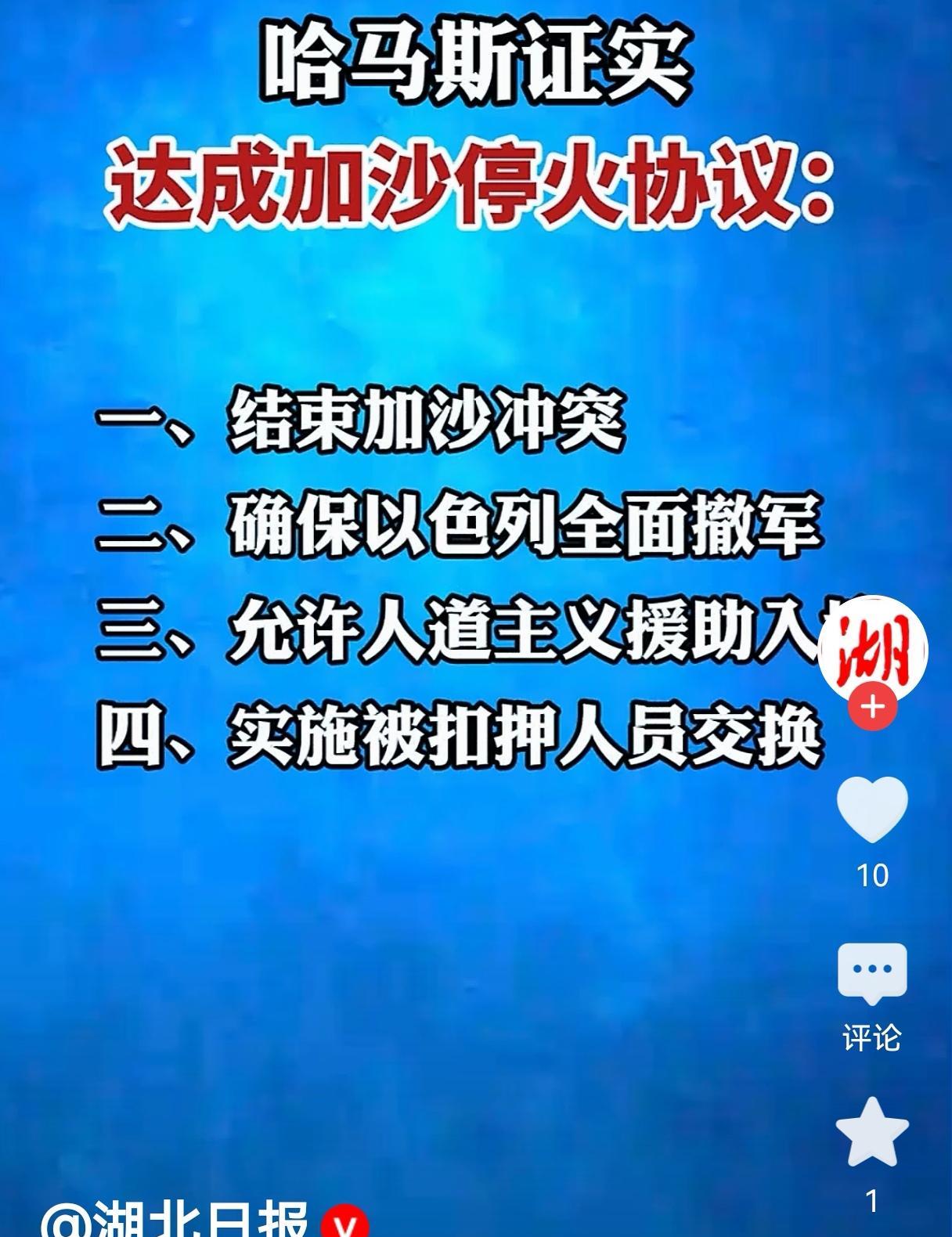 10月9中午,日哈马斯与以色列代表在埃及城市沙姆沙伊正式签署“停火协议”,从签署之日开始正式生效!停火分几个阶段:停火、撤军、人质交换和救援物资进入加沙,11日将进行首批人质交换,加沙罕尤尼斯居民在街头庆祝持续2年的战争停战,加沙城断电断网,哈马斯工作人员手持腊烛挨家挨户通知,大家可以走出隐藏室了,安全了!