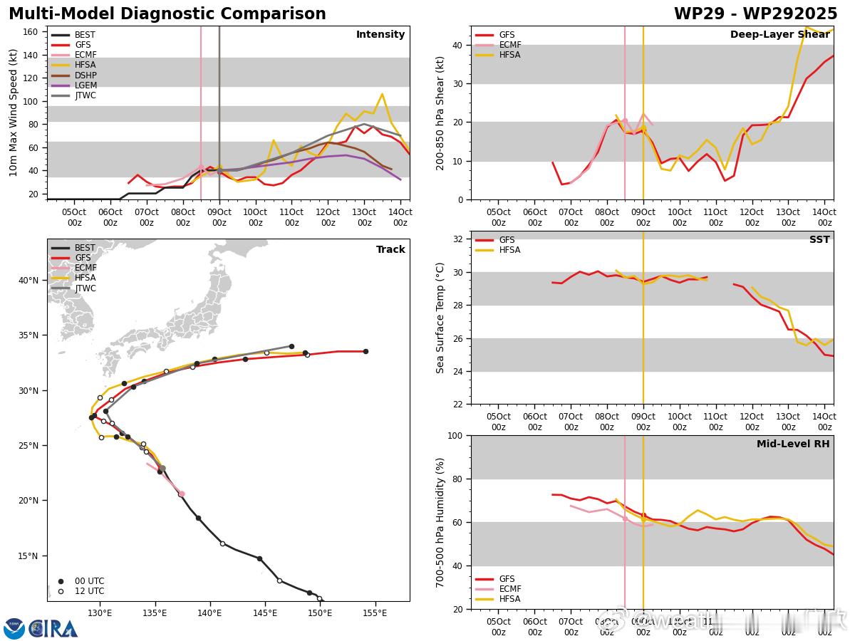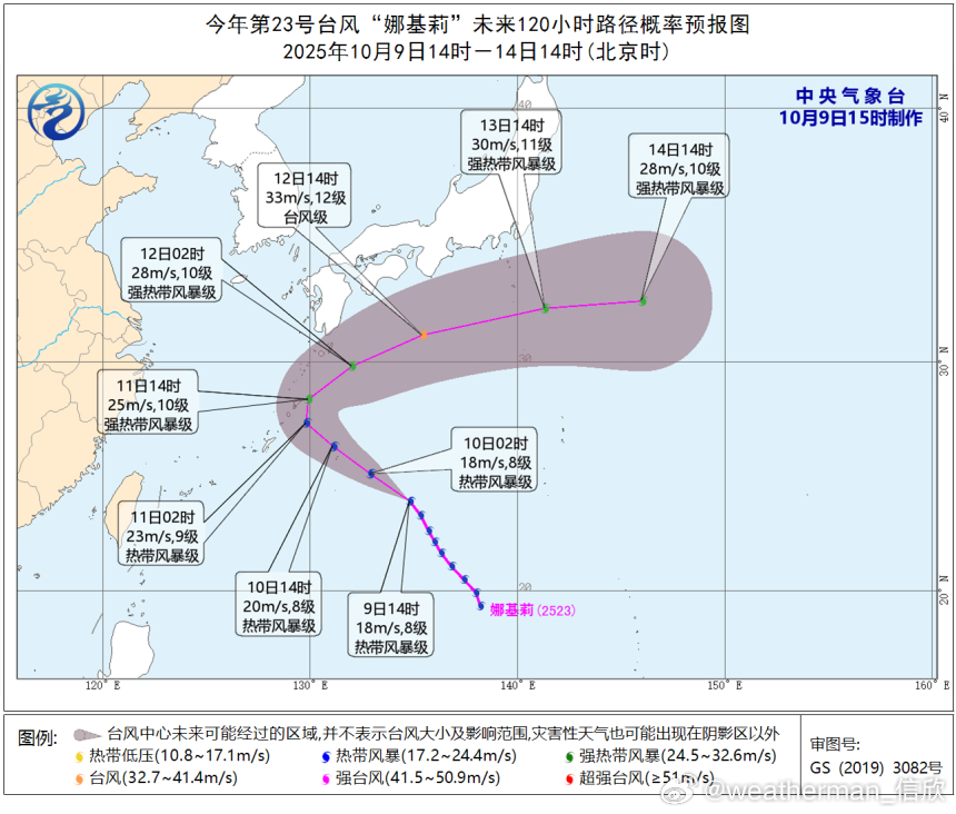 从云图看,台风娜基莉的低空环流和核心对流分离,说明垂直风切变较大。这也使得台风难以发展,今天14时还是热带风暴的下限水平,18米/秒。未来北上过程中,垂直风切变可能会减弱,强度会发展增强。