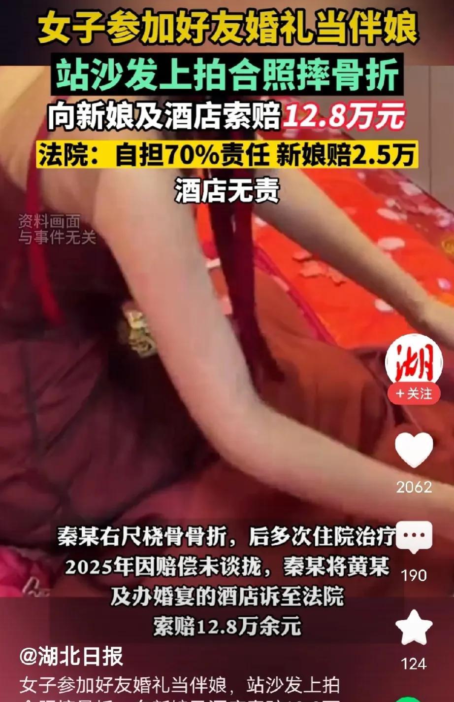 陕西,女子的闺蜜结婚,她去当伴娘,在酒店做婚前准备的时候,摄影师让女子和另一伴娘陪同闺蜜站到沙发上拍照,谁料,沙发突然往前倾斜,三人同时后仰摔跤,女子伤得最重,被紧急送医,后经诊断,女子右尺桡中段骨折,她在医院陆续住院65天,事后,女子跟闺蜜因索赔金额谈不拢,一气之下,把闺蜜和酒店告上法庭,索赔12.8万,最终,法院这么判。 2022年黄女士和男友结束恋爱长跑,携手走进婚姻的殿堂。 黄女士的婚礼定在2022年10月1日举行,办婚礼前,黄女士就诚恳地邀约好朋友秦女士来当她的伴娘。 秦女士跟黄女士是认识多年的好友,称得上是闺蜜,两人平时有事没事经常腻歪在一起,如今朋友结婚,秦女士当然要见证她这人生重要的时刻。 2022年10月1日早上6点左右,秦女士和另一名伴娘早早的就陪同黄女士来到酒店做婚礼前的准备。 大概6点10多分,摄影师也来到酒店了,摄影师进入酒店房间后,看到几个姑娘化好美美的妆容,就提议给她们拍几张合照。 姑娘们很配合摄影师的安排,都想在这一天留下美美的照片。 大概6点半左右,摄影师突然发现沙发一角能拍出不错的影片效果,于是叫黄女士和两个伴娘站到沙发上,打算给他们拍照。 不料,意外发生了,几个姑娘刚站到沙发上,还没来得及拍照,沙发突然往前倾斜,3个姑娘站不稳,集体往后倒。 3人有的头撞到墙壁上,有的直接摔到沙发后背,有的直接卡在沙发跟墙壁之间,都不同程度受了伤。 其中,秦女士伤得最重,她从沙发上摔下来后,想用手臂支撑自己爬起来,发现手臂钻心地疼,疼得她眼泪都出来了,而且根本使不上力。 之后,有人打了急救电话,秦女士被紧急送医救治。 到院后,经过医生检查诊断,秦女士右尺桡中段骨折(尺骨粉碎性),秦女士拒绝了做手术,而是选择手法调整复位,石膏夹固定。 秦女士以为,过段时间手臂会慢慢恢复,完好如初,让她没想到的是,几个月过去了,她的手依然很疼。 2023年1月20号,秦女士到上级医院复查,因为恢复不好,先后住3次院,加起来65天。 2023年4月26日,秦女士出院时,病历显示,骨折手术后恢复不理想,导致右臂神经受损,出现了活动不便、感觉异常和肌肉萎缩的情况,需要长期康复治疗。 秦女士觉得委屈极了,她没想到好好地参加个婚礼,却给自己带来这么大的伤害。 因为手臂受伤,她花了不少钱和精力,即便这样,还有很严重的后遗症,秦女士希望黄女士能给自己一定的赔偿。 可双方就赔偿金额一直谈不拢,秦女士干脆撕破脸,把黄女士和酒店告上法庭,向他们索赔12.8万元。 法院经过审理认为,这不是酒店设施问题,是新娘请伴娘免费拍照时摔的。 伴娘作为成年人,明知站到沙发上有风险,自己没有做到注意安全问题,而且出事后曾拒绝住院治疗延误最佳治疗期。 所以,秦女士得自己承担70%的责任;新娘作为受益人承担30%,法院认为秦女士医保已报销的3万多也该退回。 法院认定,秦女士各项损失加起来共8.4万余元,最终,秦女士退回已报销的医保37612.23元,黄女士赔偿秦女士25214.42元。 那么,从法律角度如何认定这个事呢? 1、新娘黄某作为婚礼的受益方,邀请秦某担任伴娘,对秦某的安全负有合理注意义务,但其未对站沙发拍照的风险进行提醒或制止,存在过错,需承担30%责任。 《民法典》第1165条规定,行为人因过错侵害他人民事权益造成损害的,应当承担侵权责任。依照法律规定推定行为人有过错,其不能证明自己没有过错的,应当承担侵权责任。 后续酒店方提交录像证明沙发为细腿无滚轮,已尽到设施安全保障义务,无证据证明其存在过错,故不担责;秦某作为完全民事行为能力人,未预判站沙发的风险,自身存在主要过错。 2、《民法典》第1173条规定,被侵权人对同一损害的发生或者扩大有过错的,可以减轻侵权人的责任。 秦某明知沙发非承重登高工具,仍听从建议站上拍照,对损害发生存在直接过错。 且其首次治疗时拒绝住院,选择保守治疗,客观上延误了病情恢复,导致神经损伤、肌肉萎缩等后果加重,自身过错显著,法院据此认定其自担70%责任,符合“过错相抵”原则。 医疗费用依法应当由第三人负担,第三人不支付或者无法确定第三人的,由基本医疗保险基金先行支付。 基本医疗保险基金先行支付后,有权向第三人追偿。 秦某的损伤明确存在责任方(黄某),医保统筹账户报销的37612.23元本应由责任方承担,属于“应当由第三人负担”的费用,故法院要求其退还医保款项,避免“双重获利”。 有人说,秦女士去给闺蜜当伴娘,就因为拍张照从沙发摔下受重伤,后续治疗还留后遗症,最后自己要担七成责任,想想都觉得憋屈又无奈。 对此,大家有什么看法? @猫眼学法