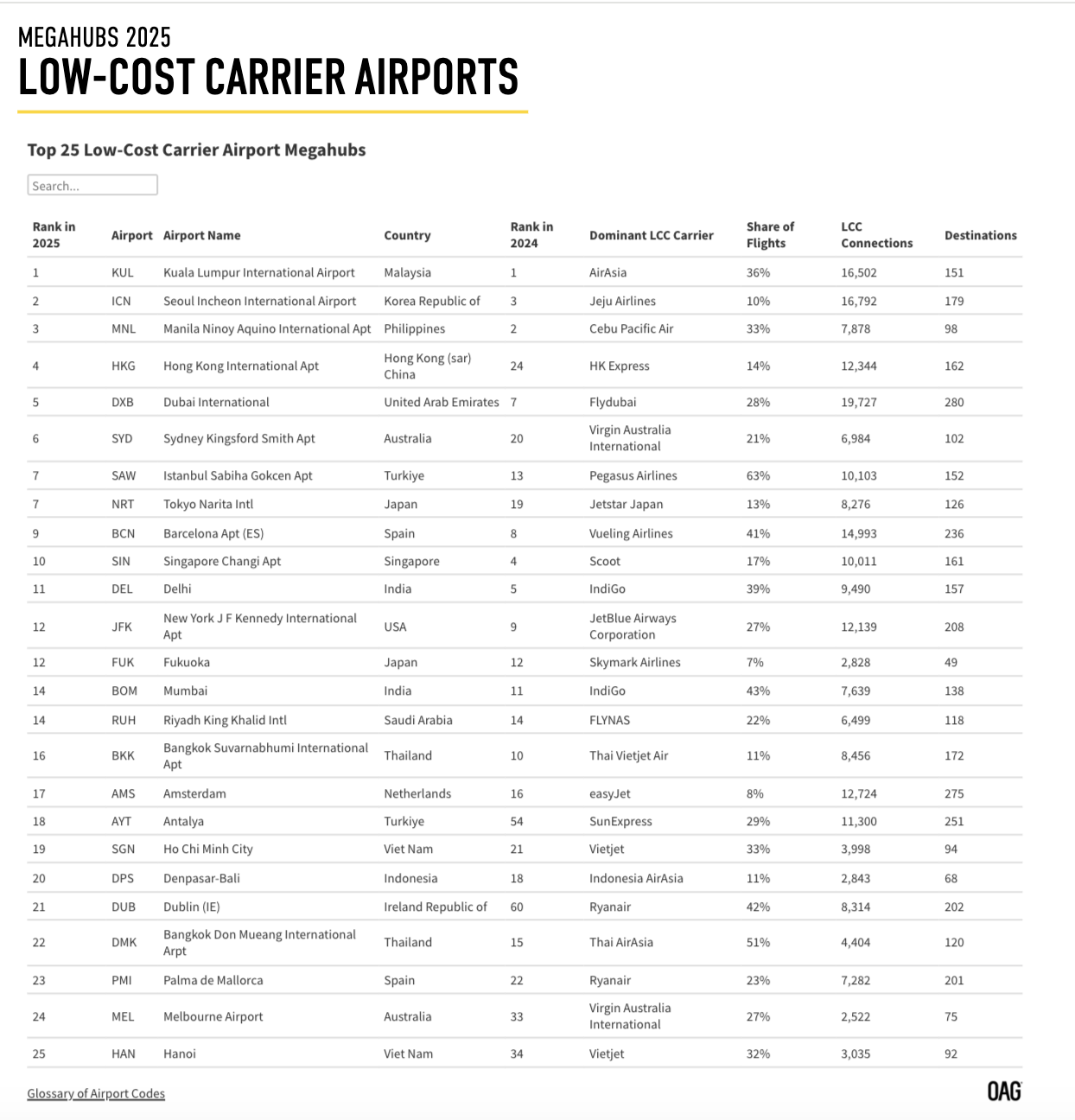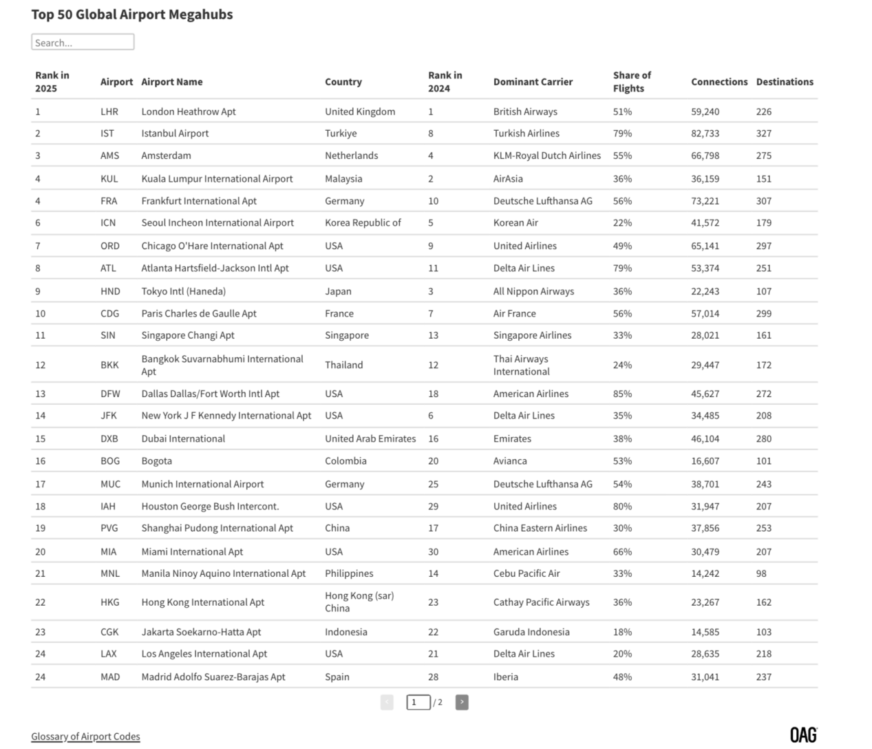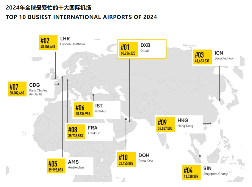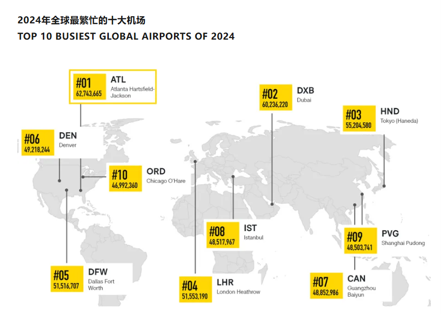 据全球领先的旅游数据平台OAG发布的“2025年全球航空枢纽连通度报告”,中国机场再度无缘进入全球航空枢纽十强,排名最高的上海浦东机场位列全球第19位,而2024年,浦东机场还是全球第17位,2023年时位列第32位,排名不高,且起伏不定。 被寄予厚望的中国香港机场,这几年来也只排在20-40名的区间。结合多次缺席全球最繁忙空中航线的现况,以浦东机场、白云机场、大兴机场等为代表的中国知名机场,或许应对此做出相应的调整与改变。 国际连通性,中国机场数据不佳 全球航空枢纽连接度的高低,意味着相关机场的国际连通性,以及提供的转机与服务目的地比例。 在这个榜单上,英国伦敦希思罗机场已经连续多年排名榜首,在航班份额、连接量、目的地等指标上呈绝对领先的优势。 前十序列里也是以欧美知名机场居多,亚洲机场以日本羽田机场、韩国仁川机场和马来西亚吉隆坡机场上榜较多,中国机场一直未能进入前十。 对于机场、航司和所在城市或地区而言,国际航线的“含金量”显著高于国内航线,于是近年来出现了这样的情形:各地为国际航线、航班的开通激烈竞争,而中国机场的国际连接度迟迟没有实现预期的提高。 全球民航产业复苏,我国民航产业也逐渐恢复,但国际市场的恢复进度不如国内市场。尽管如此,上海、广州、深圳、成都、杭州等城市机场的国际运力已超过2019年的水平,国际航线的份额也有较为明显的变化,比如北美的部分份额阶段性转向欧洲、中东、澳洲和非洲等区域。上海、北京开通了更多的亚洲航线,北京、广州增设了更多的欧洲航线,广州的中东航线有所增加。 全球最繁忙机场,仍有广州白云、上海浦东和香港机场 虽然国际航线与航班的业绩未达预期,但广州白云机场、上海浦东机场和香港机场依然凭借国内业务跻身2024年的全球最繁忙十大机场与十大国际机场。 其中,作为粤港澳大湾区首座五跑道机场,也是中国第二座拥有五跑道的广州白云机场,以超过4800万个座位排名第一,上海浦东机场则是排名运力增长幅度第一,上海仍是国际交流的桥头堡。 值得注意的是,低成本航空正在国际航空枢纽建设里拥有越来越多的市场份额和影响力。尤其是亚太地区的知名机场,香港机场表现尤为出色。近期香港宣布将扩大豁免缴付飞机乘客离境税的涵盖范围,此举被认为有助于吸引更多旅客选择香港作为中转站。 泰国的曼谷新机场(素万那普机场)甚至以115家航司,高于法国巴黎戴高乐机场的105家,成为全球拥有航司最多的机场,其主打的“开放”和“机票便宜”功不可没。 全球航空市场的供需主导权之争,中国机场不容有失 全球最强航空枢纽之争,实质上是全球航空市场供需主导权的竞争,从客流量来看,中国的头部机场并不输于排名靠前的海外知名机场,但国际连通性上涉及的因素较多,短时间内可能难以有颠覆性的改进。 在被高铁大量分流国内客源的情况下,面对国际连通性和盈利等核心问题,中国机场和航司目前确实还有较大的提升空间,需要进一步摆脱“有规模、高客流、低效率、低连接、难盈利”的现况。 大多数的中国机场已经轻松赢下了硬件设施方面的竞赛,现在需要发力进行航线网络,特别是国际航线的拓展与争夺。