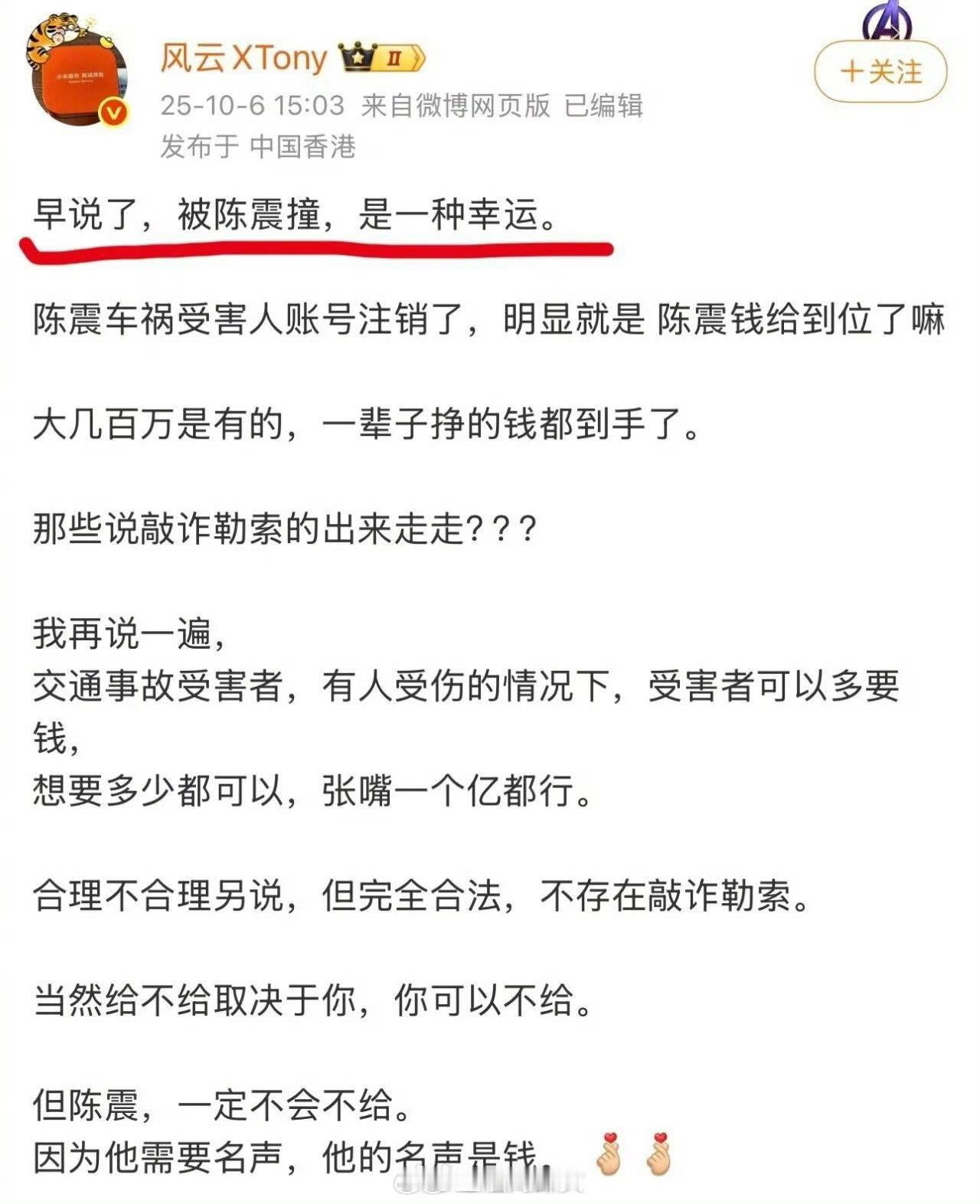百万粉丝博主称被陈震撞是幸运被禁言“被陈震撞,一辈子的钱都挣到手”?百万粉丝博