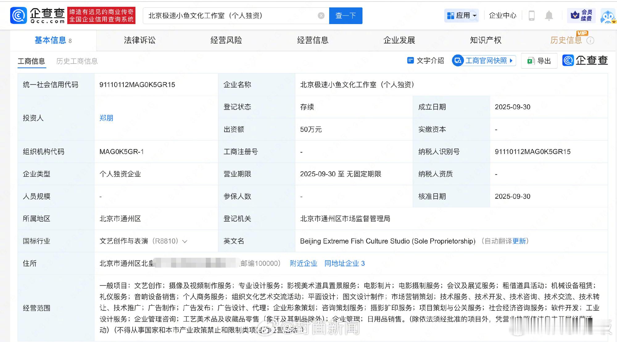梓渝成立新公司梓渝新公司叫极速小鱼 据企查查APP显示,近日,北京极速小鱼文化工作室(个人独资)成立,郑朋(梓渝)担任投资人持股100%,出资额50万元,经营范围包含电影制片、电影摄制服务等。据悉,极速小鱼为艺人 的昵称。梓渝[超话]