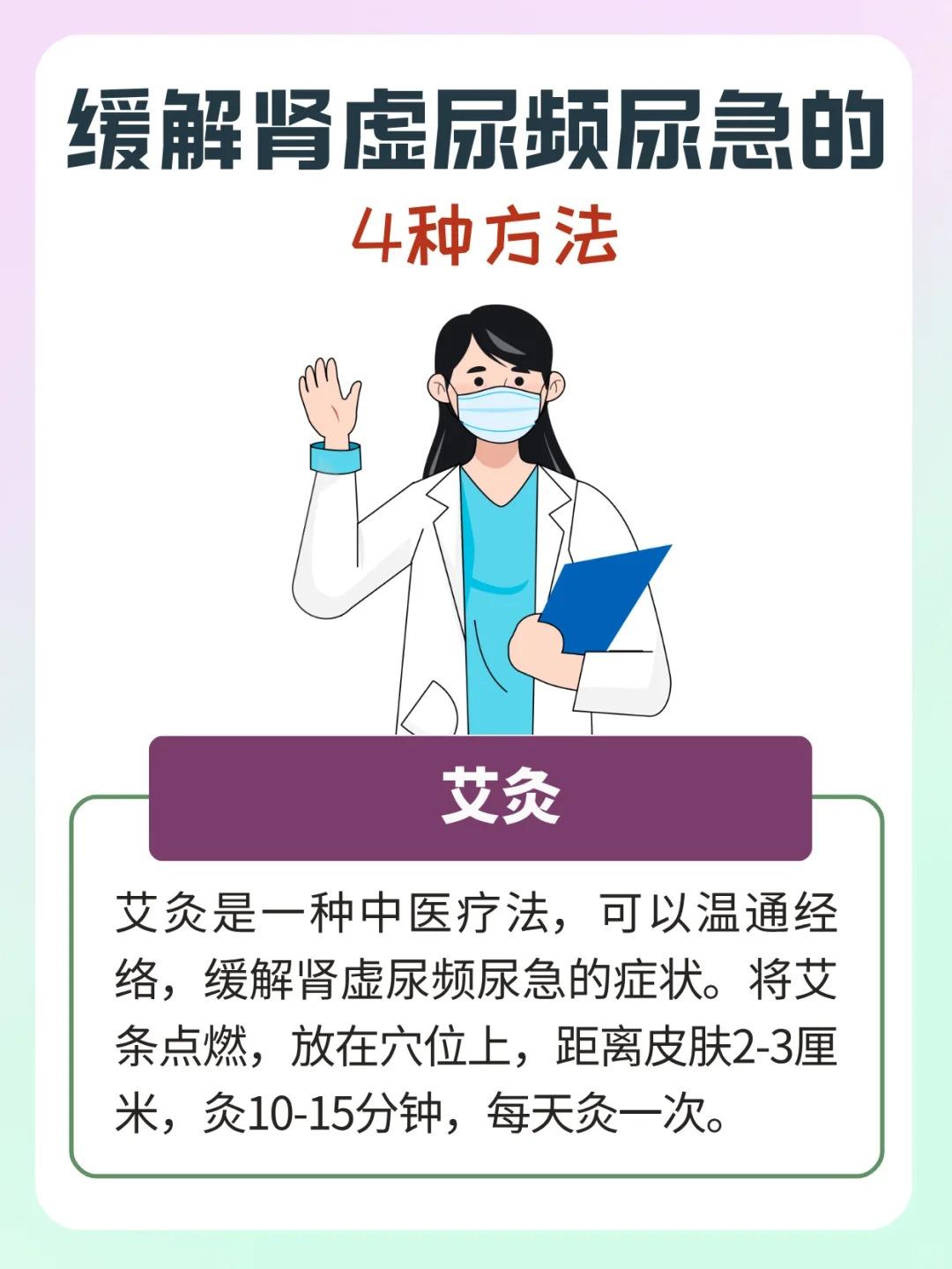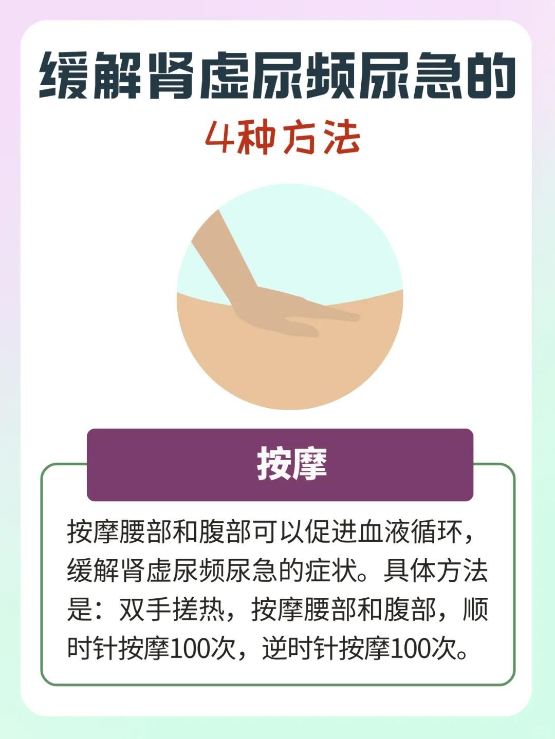 肾虚尿频尿急,这4种缓解不适的方法! 肾虚尿频尿急是一种常见的健康问题,可能会给生活带来不适。以下是4种缓解不适的方法: 1.调整饮食:避免食用过多刺激性食物,如辛辣、油腻、咖啡等,同时注意补充水分,保持身体水分平衡。 2.保持良好的生活习惯:保持充足的睡眠,避免熬夜;适度运动,如散步、太极拳等;保持心情愉悦,避免过度紧张和焦虑。 3.按摩:按摩腰部和腹部可以促进血液循环,缓解肾虚尿频尿急的症状。具体方法是:双手搓热,按摩腰部和腹部,顺时针按摩100次,逆时针按摩100次。 4.艾灸:艾灸是一种中医疗法,可以温通经络,缓解肾虚尿频尿急的症状。具体方法是:将艾条点燃,放在穴位上,距离皮肤2-3厘米,灸10-15分钟,每天灸一次。 需要注意的是,以上方法仅供参考,如果症状持续不缓解或加重,建议及时就医。同时,保持良好的生活习惯和饮食习惯,对于缓解肾虚尿频尿急的症状也非常重要。