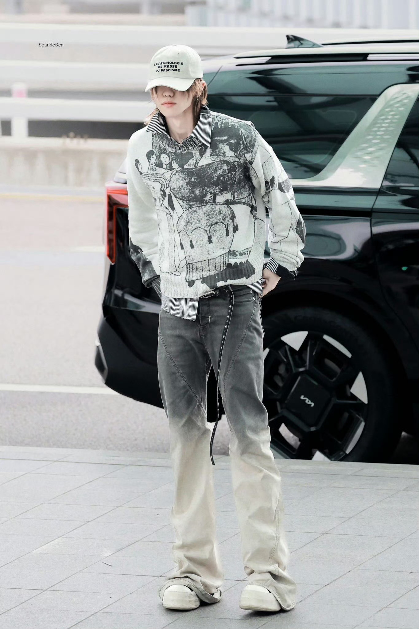 The8徐明浩今日机场出发Look🈶涂鸦式针织衫、衬衫、渐变牛仔裤、棒球帽,