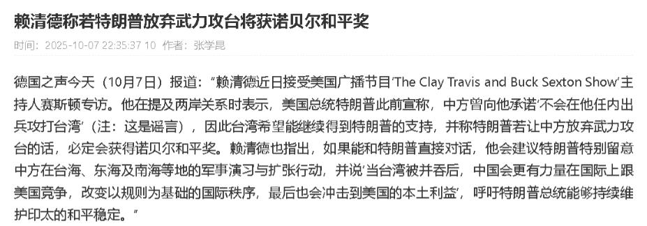 [微风]赖清德突然出来对美国总统特朗普喊话了!赖清德表示,特朗普若让中国放弃武力攻台的话,必定会获得诺贝尔和平奖。赖清德声称,如果能和特朗普直接对话,他会建议特朗普特别留意中国在台海、东海及南海等地的军事演习与扩张行动,并说当台湾被“并吞”后,中国会更有力量在国际上跟美国竞争。 台湾当局这些年一直试着把台海拉进国际视线,常用的方法就是放大“威胁氛围”。 把大陆的例行军演和海上活动说成扩张动作,目的就是让美国和盟友保持警醒,但这种做法更多只是舆论战,真要动摇两岸现实格局没那么容易。 美国和大陆建交时已经确定了“一个中国”原则,这算是关系的底线,历届美国政府不管怎么变招,都不敢真动这个根本承诺。 赖清德这种喊话,表面是诉求和平,实际上是在试探美国会不会为了台湾去碰那条红线。 但美国的外交一直是利益至上,把台海当成牵制大陆的工具,却又不想为此付出真冲突的代价。 偏偏特朗普是个现实主义高手,当年搞外交就是一切按交易逻辑来衡量,对他来说,奖项诱惑根本不算什么筹码,他更看重的是实际回报,比如经济利益、政治资本。 赖清德似乎没想透这一点,诺贝尔奖的名头对讲究自身利益的特朗普来说几乎没分量。 大陆近年来一边强调和平统一,一边保持军事威慑,核心目标就是防止外部插手,赖清德把这一系列动作全当威胁来讲,是选择了最有利于自己政治立场的解读。 但这种强硬发声,对岛内民众而言反而增加了担忧:真闹大了,吃亏的首先是自己。 经济上,两岸产业链这么紧密,一旦对抗升级,冲击最直接,岛内不少企业已经公开呼吁别让局势失控。 美国在台海问题上保持着策略性模糊,既不支持“台独”,也不明确放弃防卫承诺,这样既能捞到好处,又不用担上全责。 赖清德想用高调喊话逼美国亮态度,但这种可能性很低,特朗普更可能当作耳边风,甚至觉得被点名是种挑衅,这样一来,台湾反倒会陷入外交被动。 放眼整个局面,大国博弈的核心永远是算计自己利益,台湾只是棋盘上的一颗子,把命运寄托在外力身上,本就是高风险的事。 喊话、制造声势只是短期动作,真正能影响未来的,还是两岸之间的沟通与利益平衡,喊得再响,也替不了对话,口号再多,也解决不了实质矛盾。 赖清德这次的出招,看似掌握主动权,实则让台湾的谈判空间更窄,一旦情绪盖过了理性,局势就更难收回。 对台湾来说,最终的稳定还是得靠桌上谈,而不是话筒前的宣言。