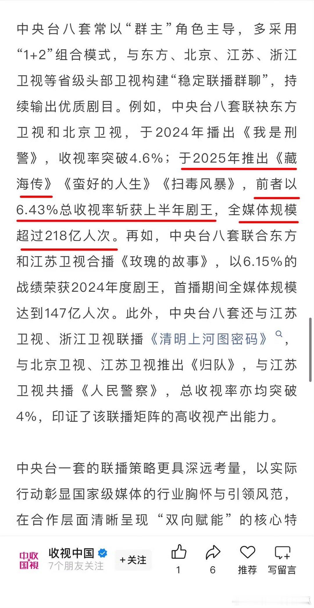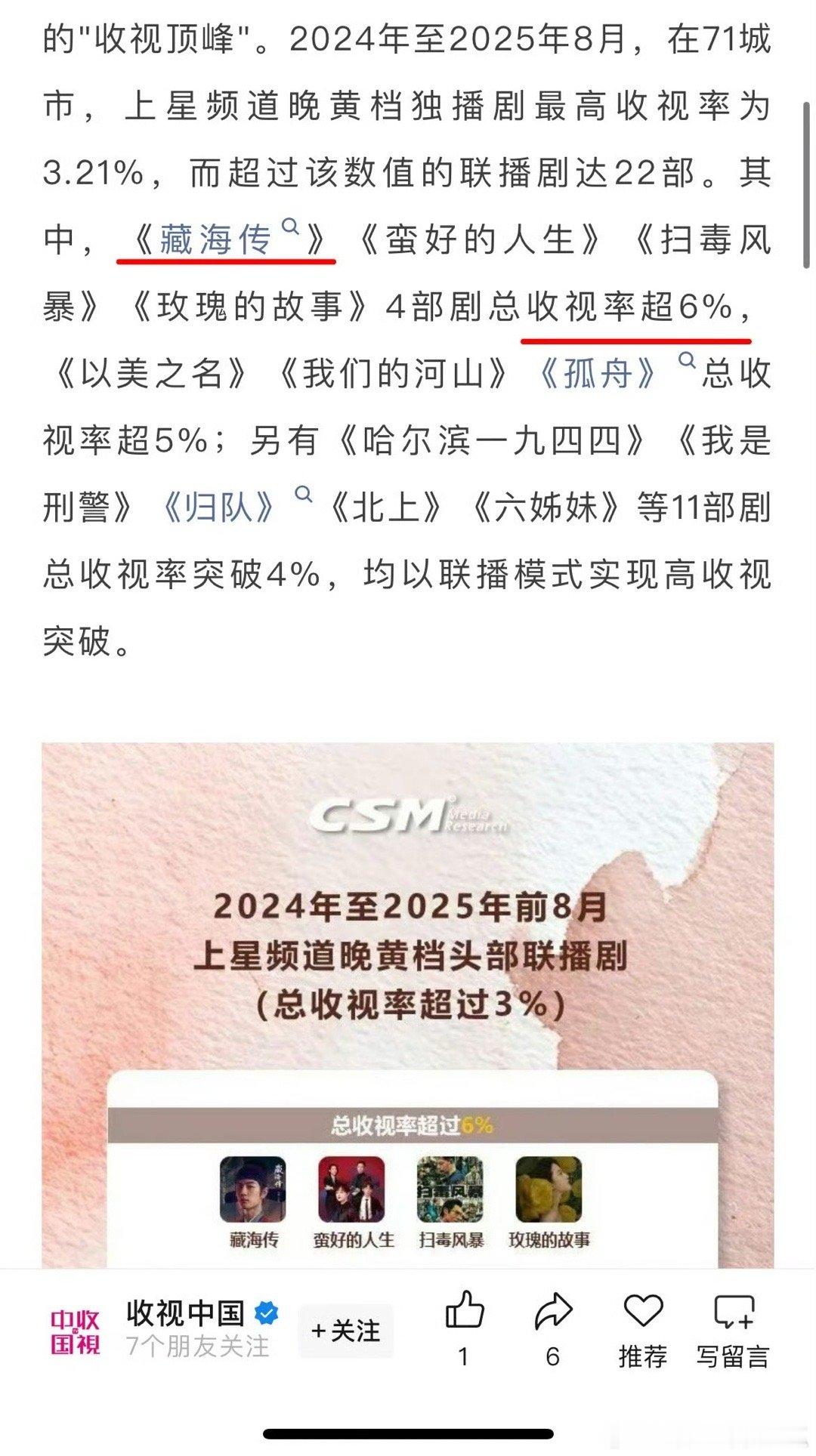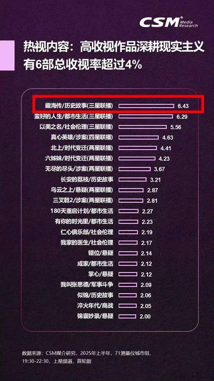 2024年-2025年8月近两年时间,仅有四部剧总收视率超过6%,《藏海传》总收视率6.43%位列第一