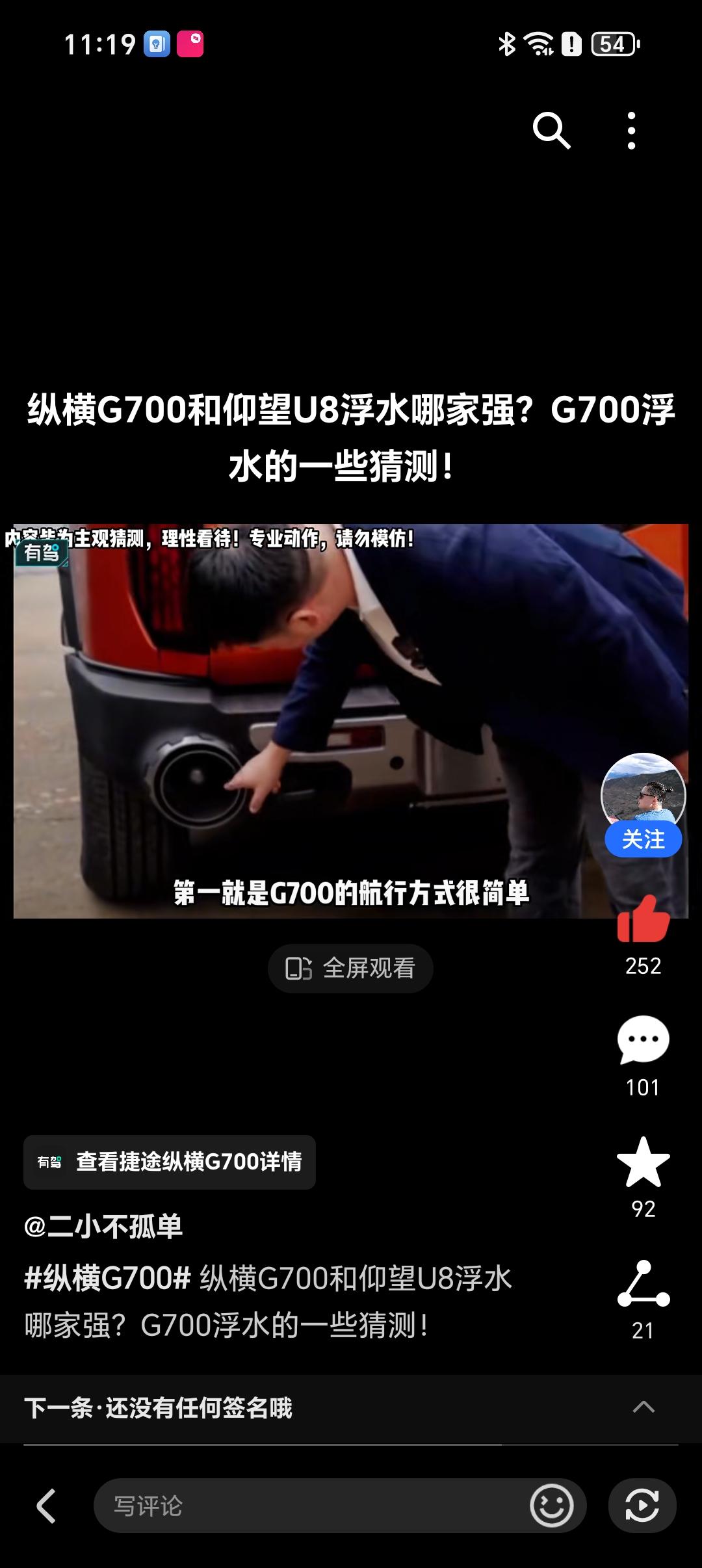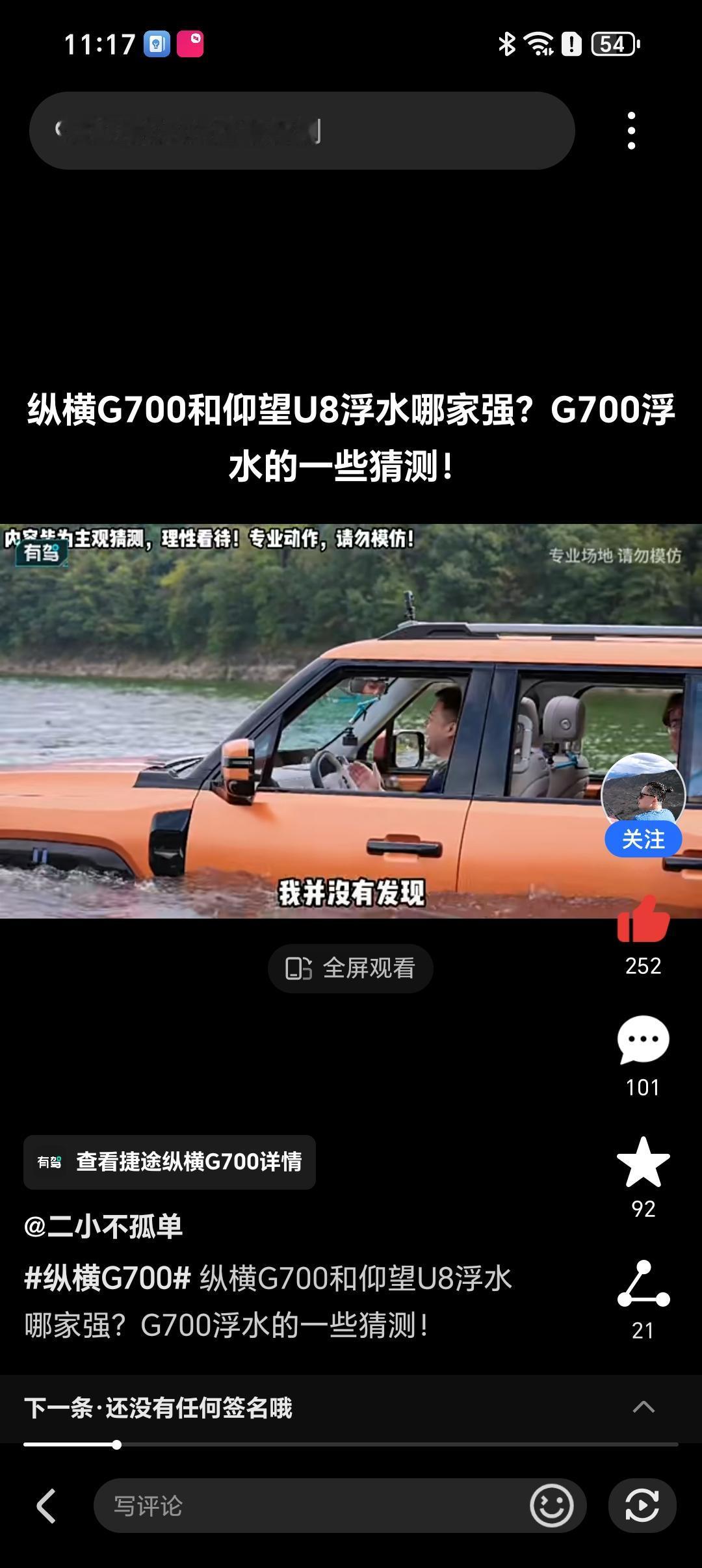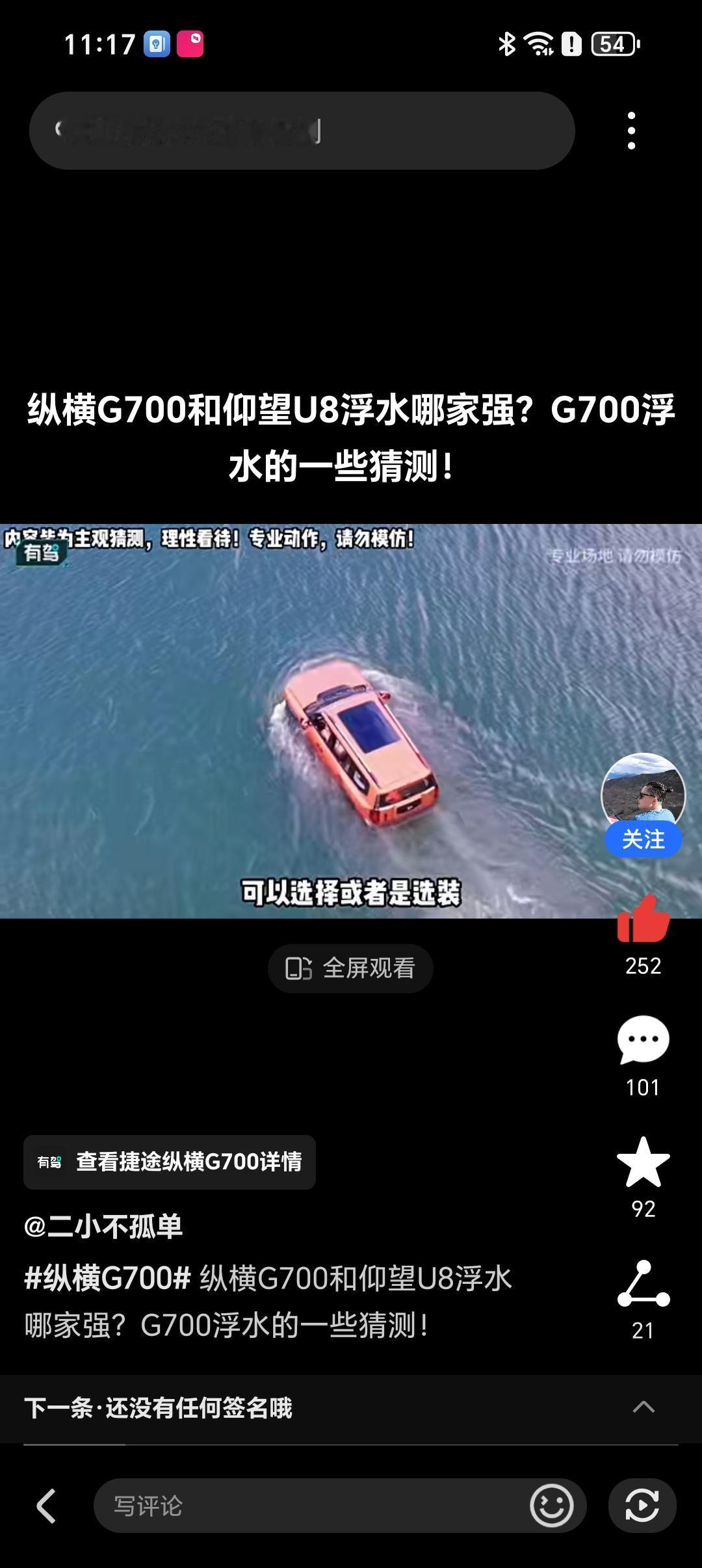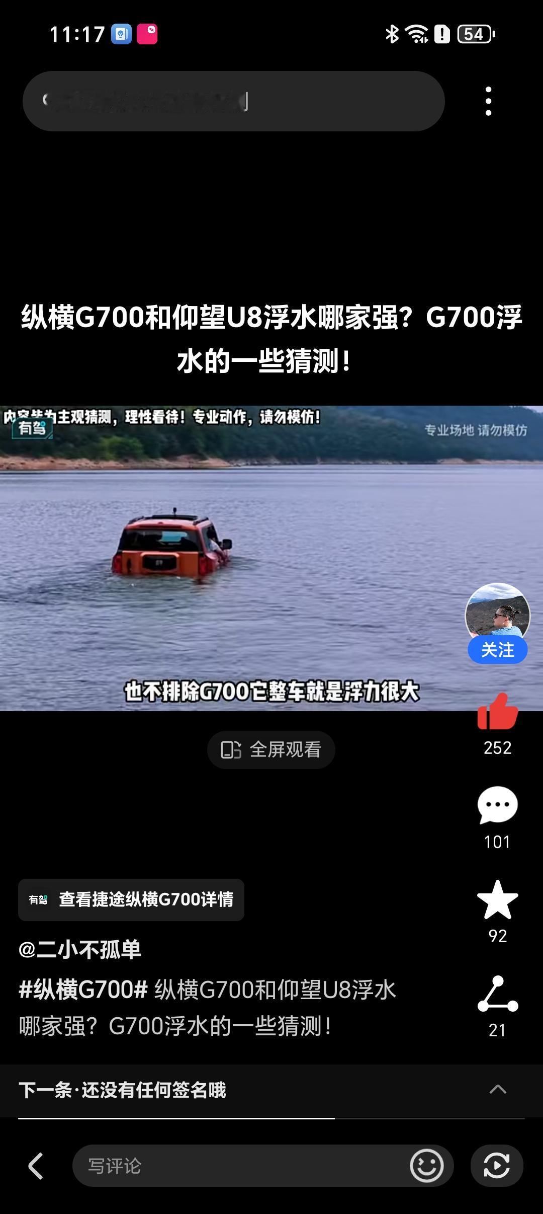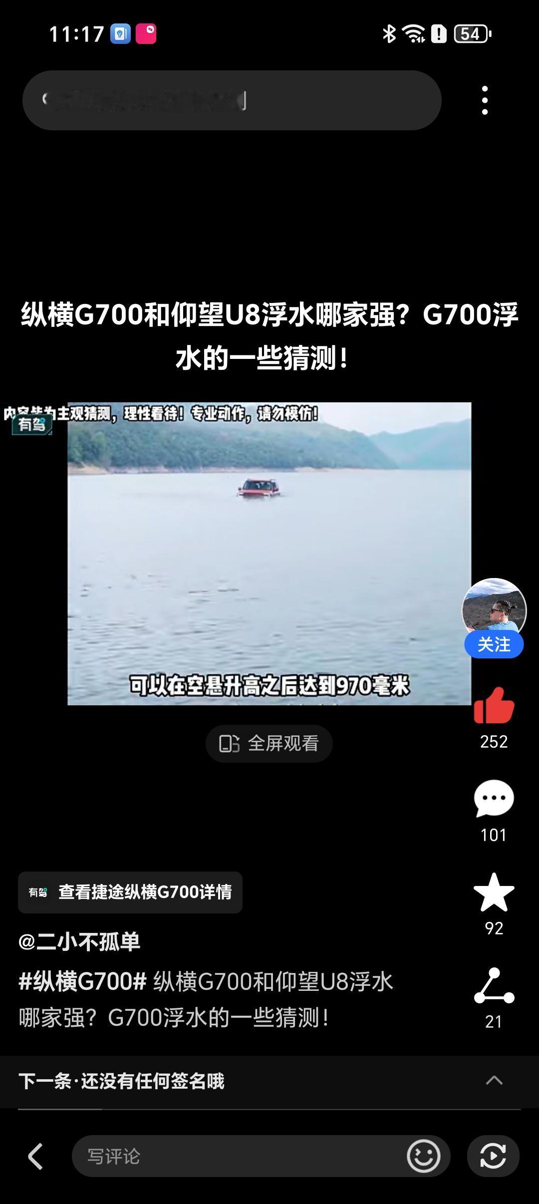 厉害了,比亚迪这一招应急浮水,奇瑞竟然也学会了。想当年仰望U8首创应急浮水,让车子也能在平静的水面,潇洒走一回。而即将上市的奇瑞g700,也不妨多让,从视频上看,车头提供的浮力也非常可观,吃水比较浅,不知道是量产就是这样还是改装效果,跟U8最大的区别就是它在水中是通过推进器行驶的,速度会更快,不过掉头应该就更辛苦一些,毕竟它没有易四方原地掉头的绝活,据说预售价不到35万,这奇瑞的成本控制也太牛逼了。奇瑞g700