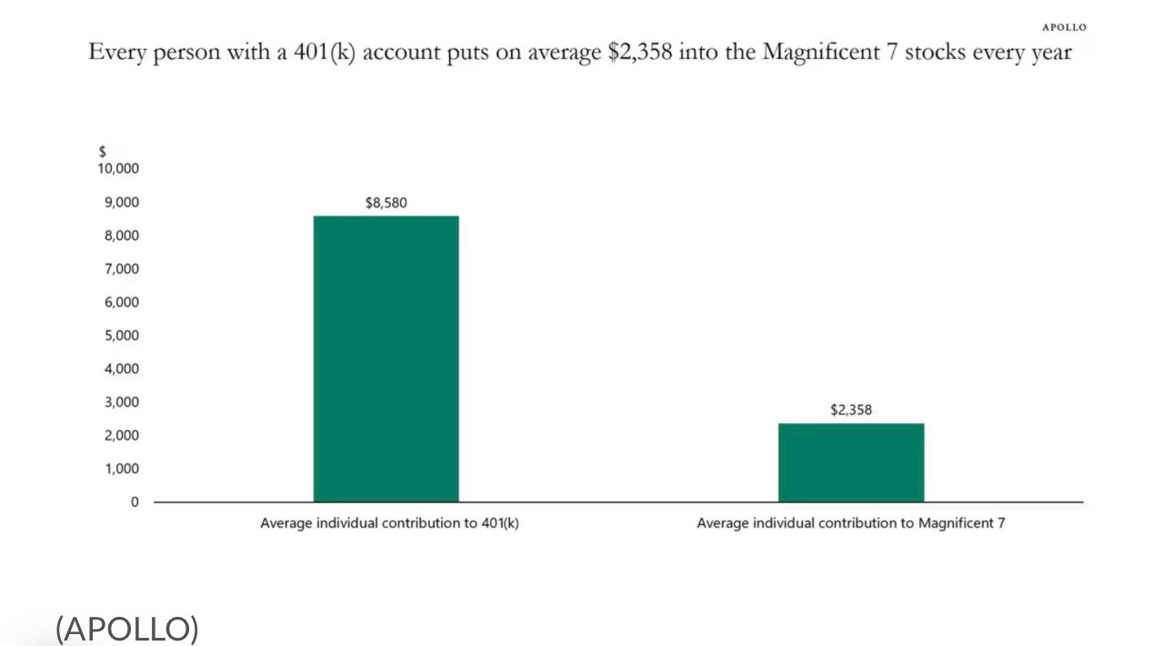 斯洛克表示:“美国工人每年平均向他们的401(k)退休账户投入约8500美元,其中71%的资产分配在股票上——而华丽七雄在标普500指数中的权重接近40%。这意味着,美国每位工人每年大约有2300美元流入华丽七雄的股票。”