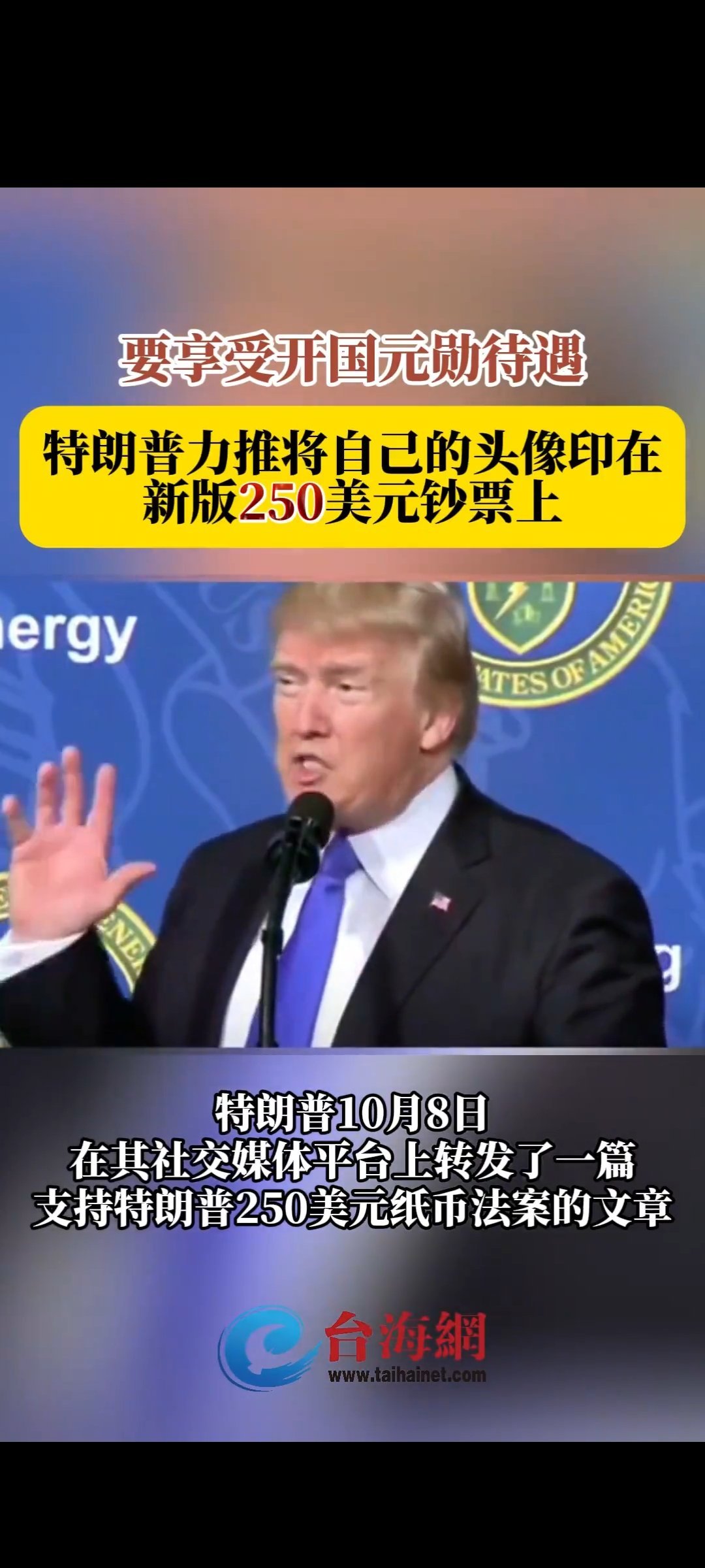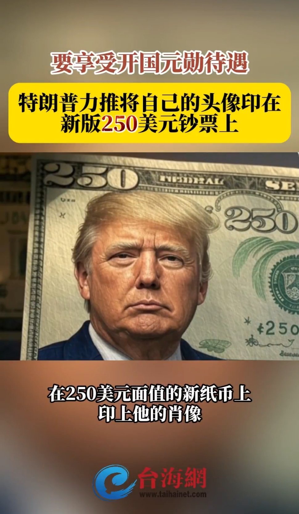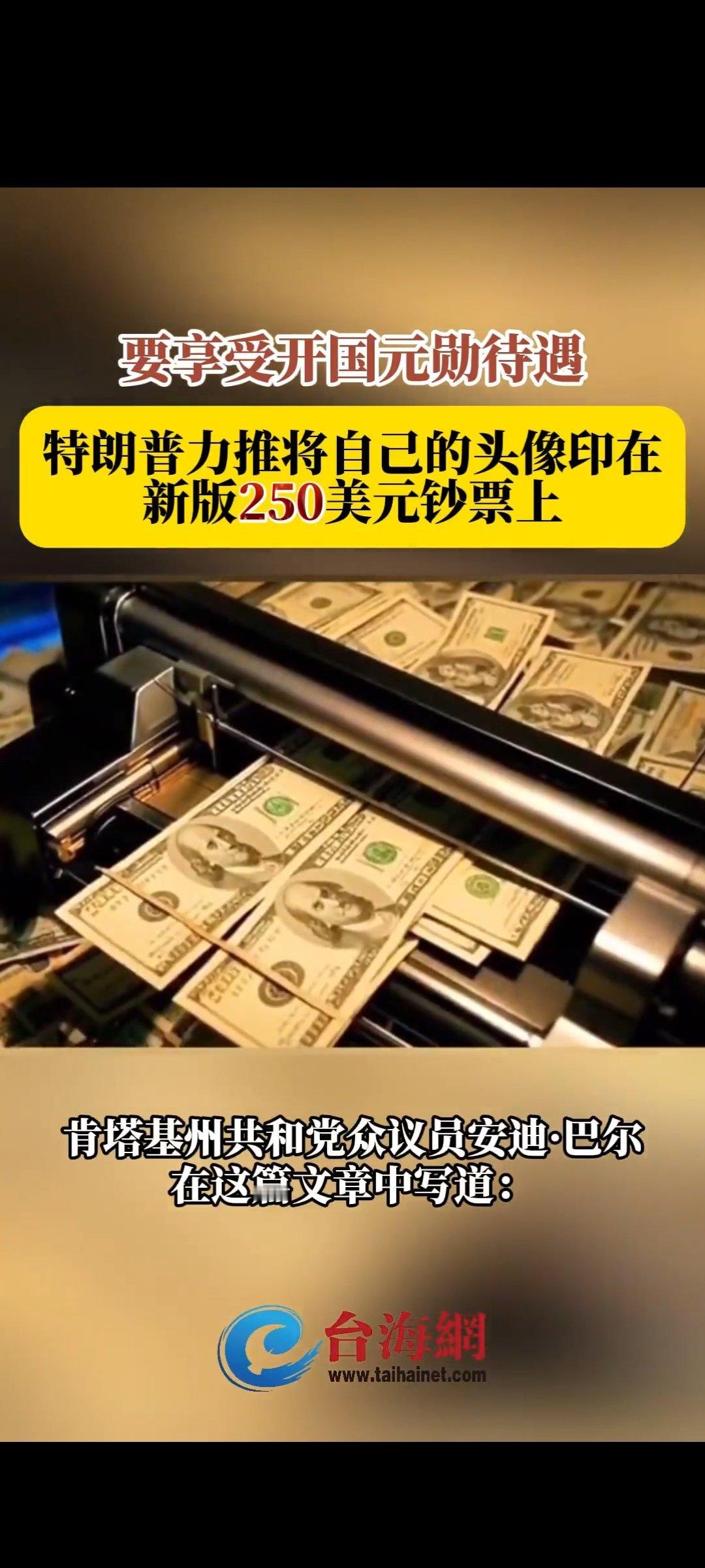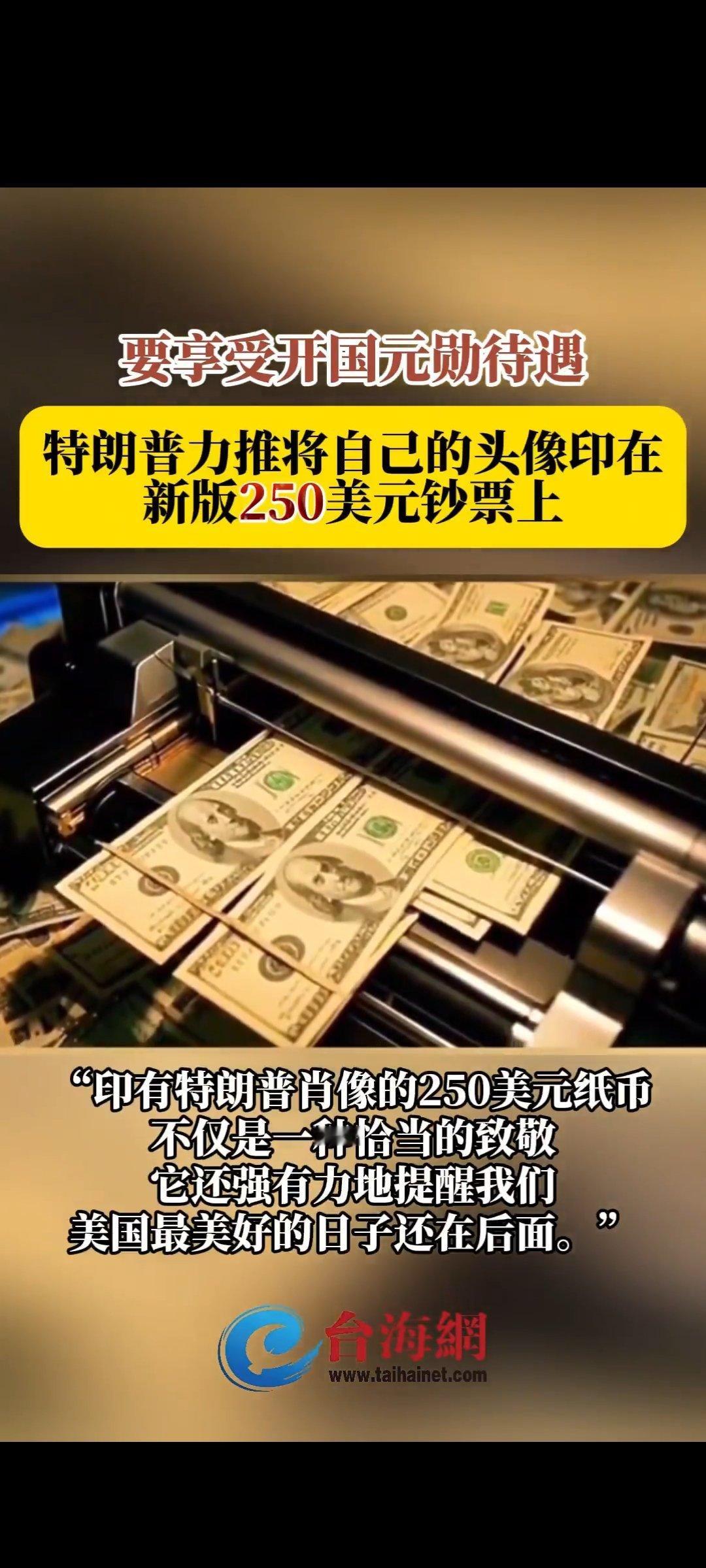 特朗普力推把自己的头像印在250美元钞票上,享受开国元勋地位。