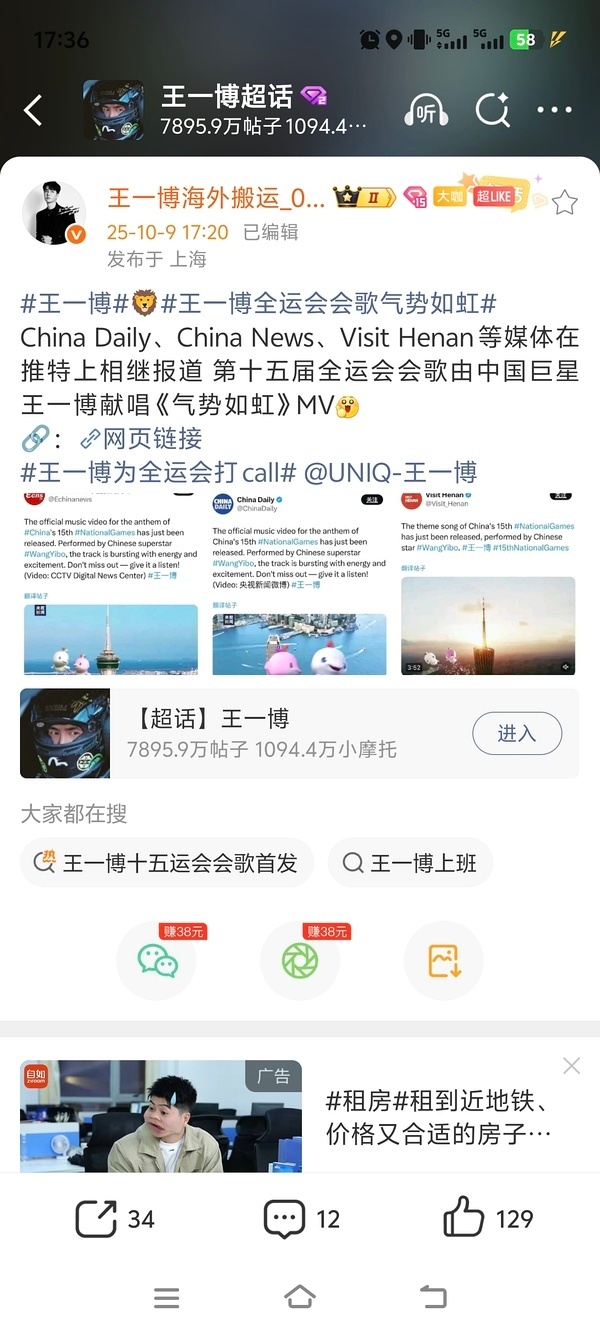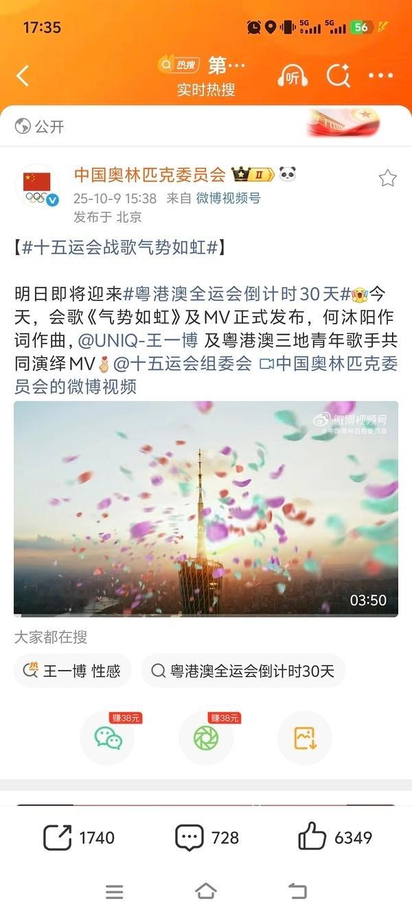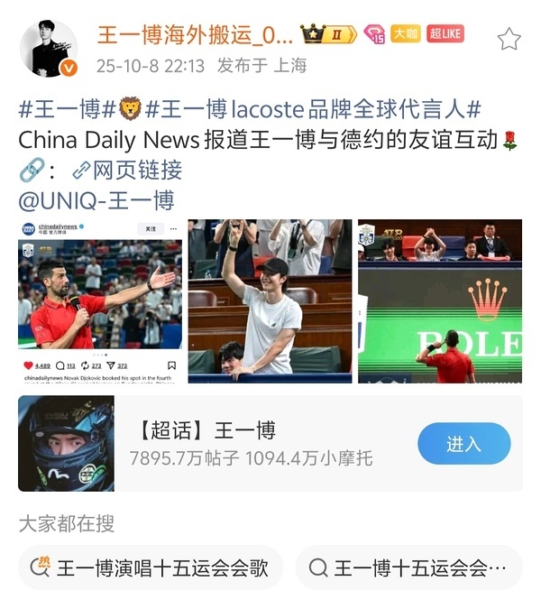 王一博:巴黎时装周罗意威待遇最好的全球代言人;看德约打球全世界媒体关注;新华社发文庆祝的亚军车手;主流矩阵发布的全运会会歌。