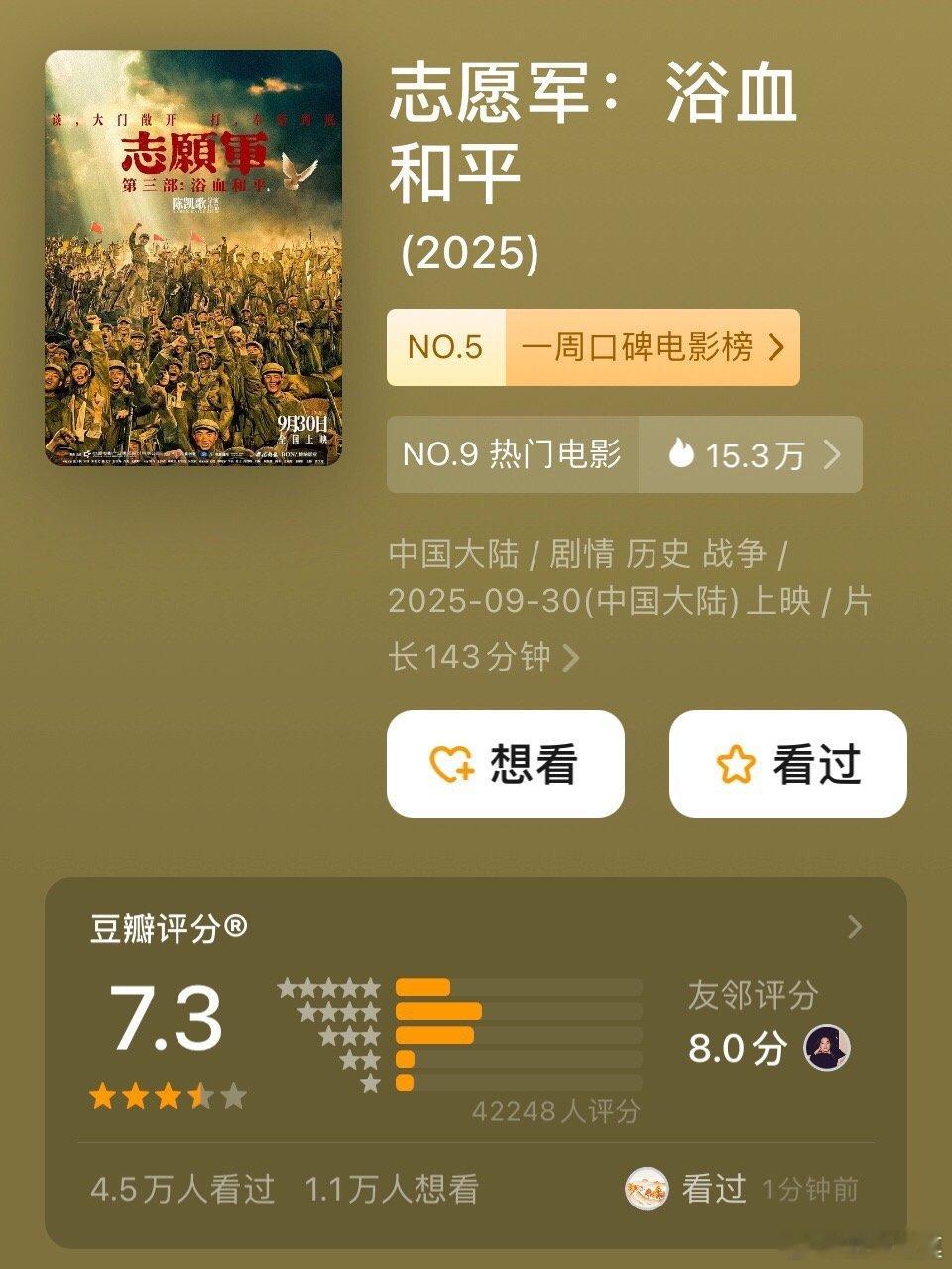 国庆档期8部新片的豆瓣评分都在下调中。包括最晚上映、最晚开分的《震耳欲聋》也从开分的7.6下跌到了目前的7.5。必须一说的是,《震耳欲聋》的打分人数已经超过了15.5万,是8部新片中最多的。其他7部影片打分人数没有一部是超过10万的。超过5万的也才1部。