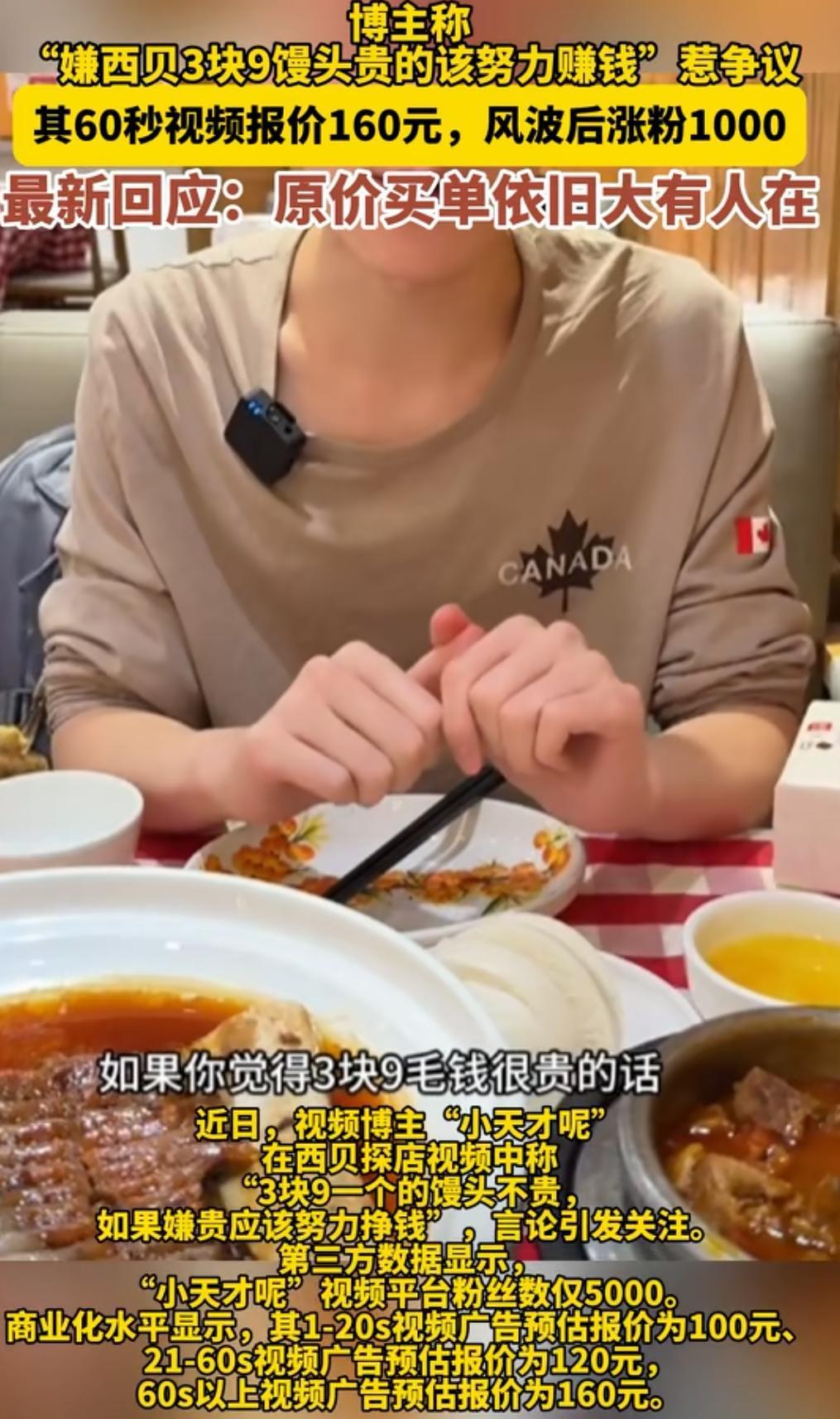 探店西贝的这货被封禁一点不冤! 仅有区区4900个粉丝,就敢大张旗鼓的探店西贝,还采访了那么多路人对西贝的看法,放言:如果觉得3.9元的馒头贵,那就努力挣钱。 “表演”没有大的漏洞,可是犯了两个低级错误: 1、吃了两口菜觉得辣,问西贝的店员能不能退,假装要换两份不辣的菜,店员爽快就同意了。看清楚是“换”,从古至今任何餐厅,只要动了筷子的菜,没有说是因为太辣能换的,把大众当傻子。 2、说觉得3.9元的馒头贵,就努力去挣钱,明显是蹭前段时间大网红某佳琦卖眉笔时说的话,有千万粉丝的大牌,最后都被干“趴窝”了,他才几千个粉丝,前者热度都过这么久了,还往上贴? 一夜之间,这货粉丝涨到了6千多,以为自己流量来了,今晚兴高采烈烈的开启直播,不多会就被封禁了。 人永远挣不到认知以外的钱,说话真不真,菜好不好吃,广大群众的眼睛是雪亮的,不用拿出拙劣的演技,硬搁那胡说八道,就显着自己能了? 西贝危机公关 西贝食材争议