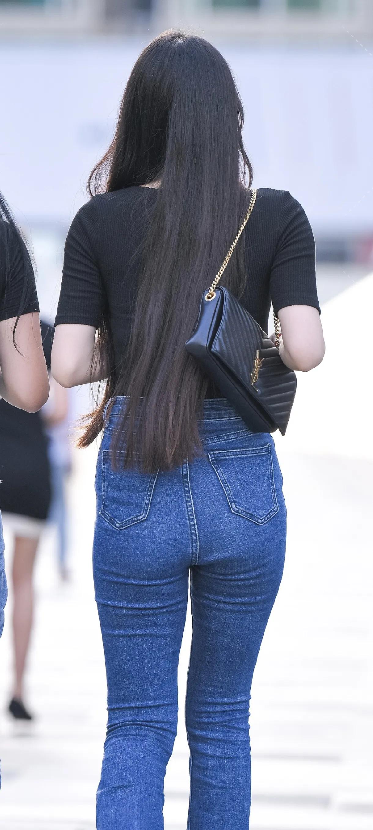 一个长发女生穿着牛仔裤。身材好的女性给你什么感受?