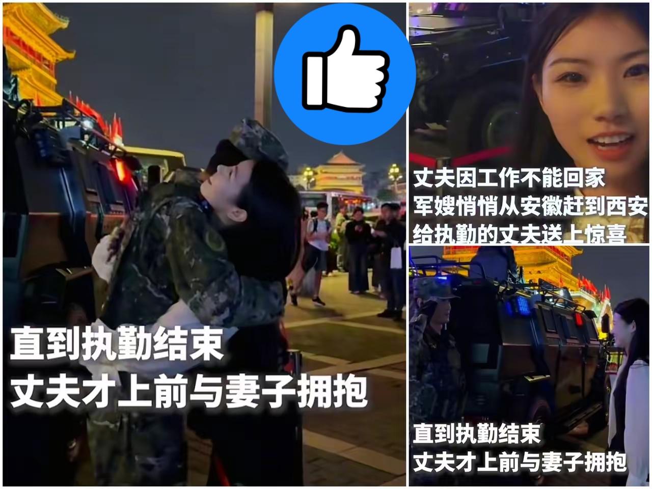 刷到这对夫妻,我手里的出游视频突然不香了 国庆刷出游视频。安徽潘红跨800里到西安,想给军人丈夫钱朋朋惊喜。 见面时丈夫只瞥一眼就去执勤。换别人早委屈了。潘红却静静等。她懂丈夫军装扛着万家安宁。 执勤一结束。钱朋朋快步冲上去抱她。那拥抱没情话,却比钻石还沉。 现在人总说婚姻要仪式感。这对夫妻偏不。你守大家,我守小家。双向奔赴才是婚姻的根。 这种藏在细节里的暖。像寒冬里的热粥。比刻意的浪漫实在多了。你们刷到过这样的故事吗?