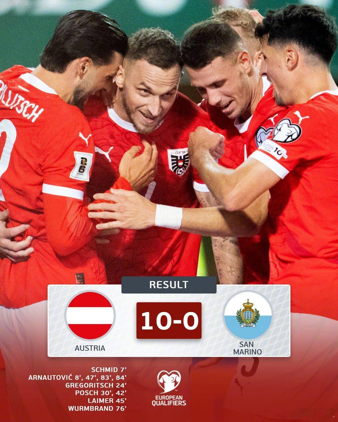 【残暴!】世预赛,奥地利10比0大胜圣马力诺,刷新队史赢球比分纪录,6人进球,波施梅开二度,阿瑙托维奇上演大四喜!