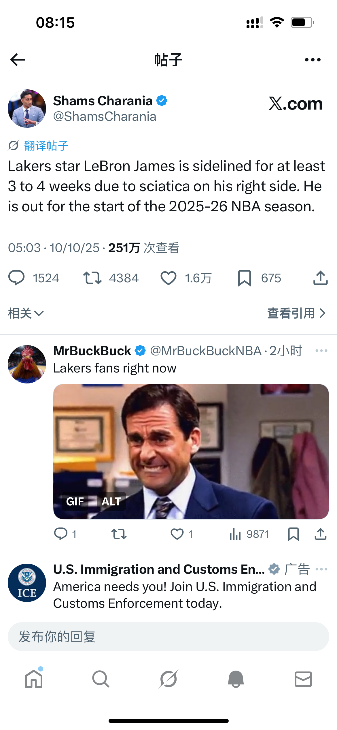 Shams:湖人球星勒布朗·詹姆斯因右侧坐骨神经痛将至少缺阵3到4周。他将缺席2025-26 NBA赛季的开局阶段。