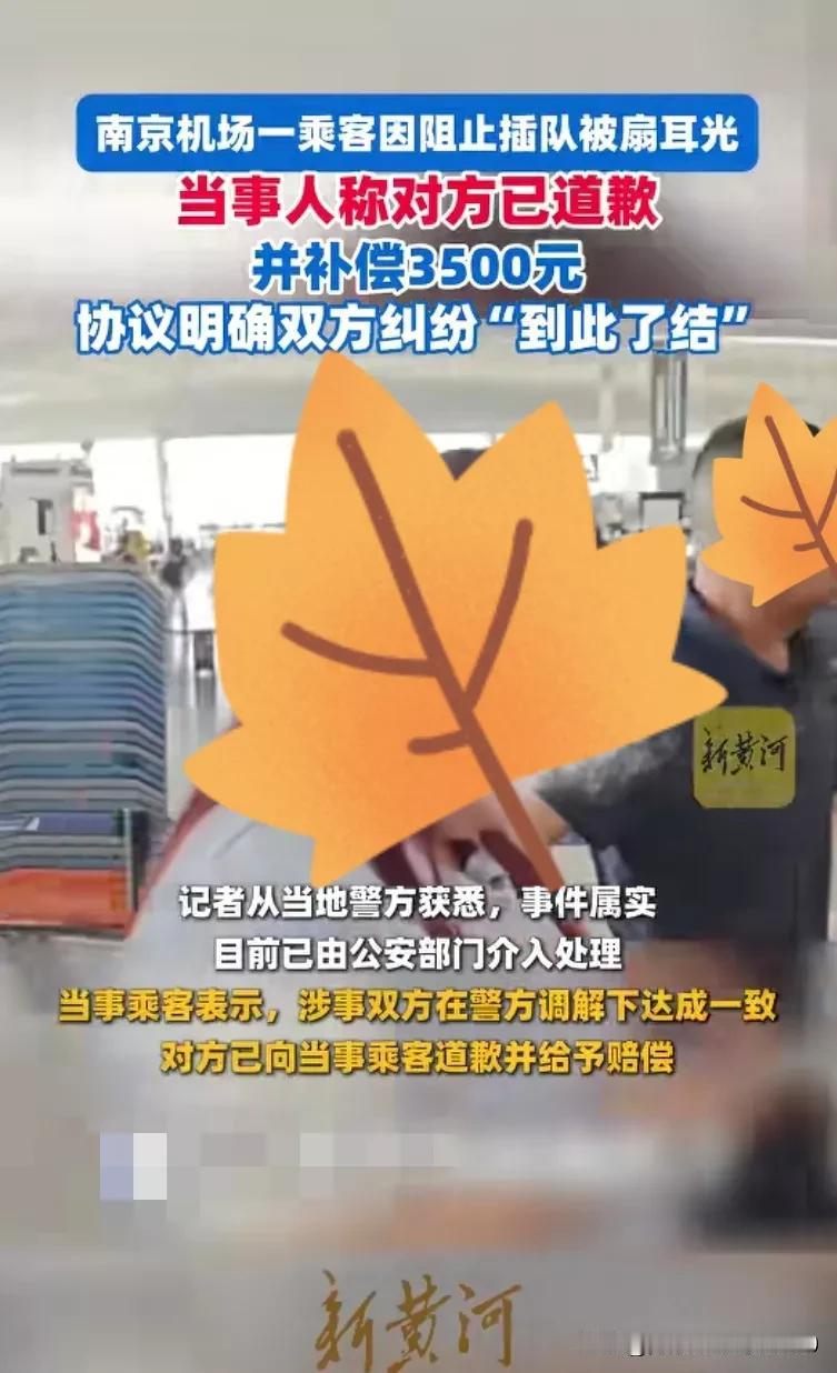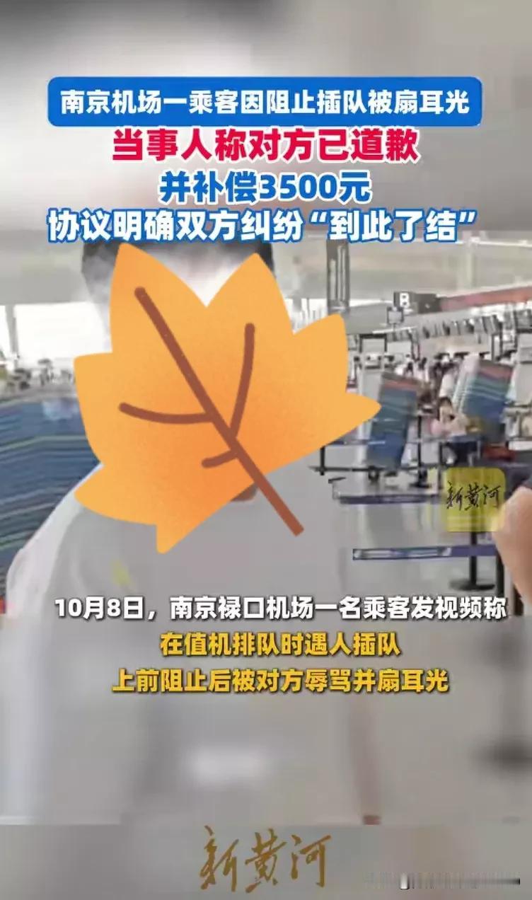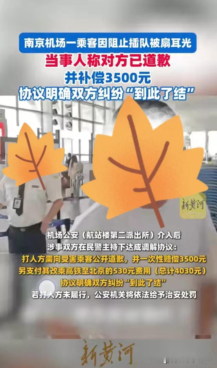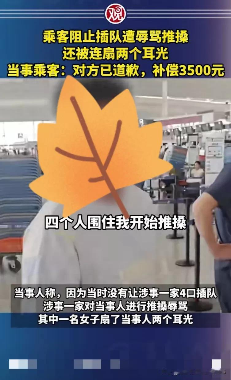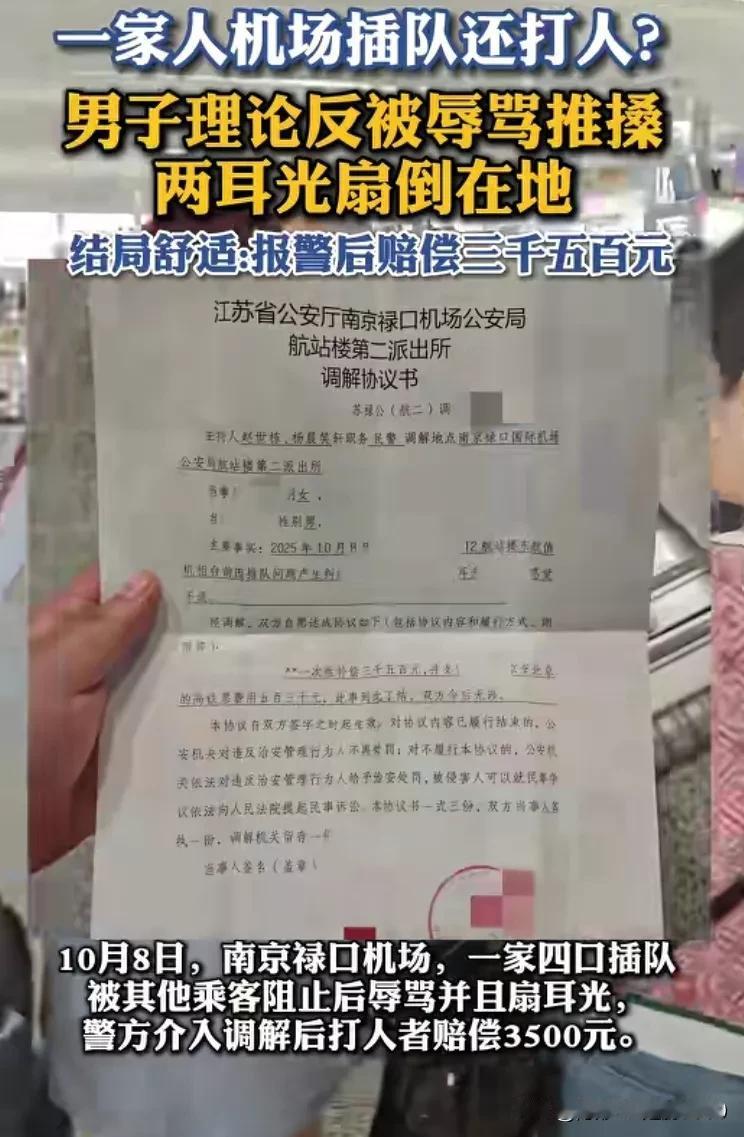 江苏,机场插队,男子说:插队不对!反被辱骂、推搡,扇两耳光,男子倒地。 警方介入调解后,插队者道歉,一次性赔偿3500元,支付高铁票费用530元。 退一步讲,本来插队是不对的,还这么没礼貌,还动手了,这还要怎么惯着?看赔偿金额,又嚎啕大哭,这演技也太好了吧? 该说不说的,4030元不多,如果被打的人,躺地不起,去医院检查,哪都不舒服,万八千的都不够。如果下次排队,就不会掏这钱赔偿了,相当于赚钱了。