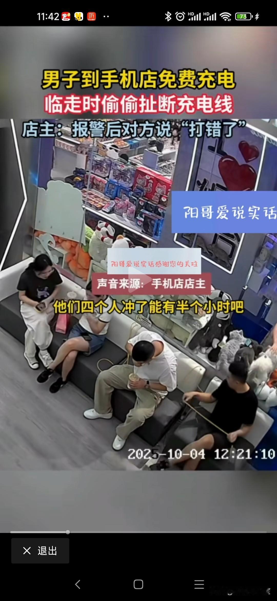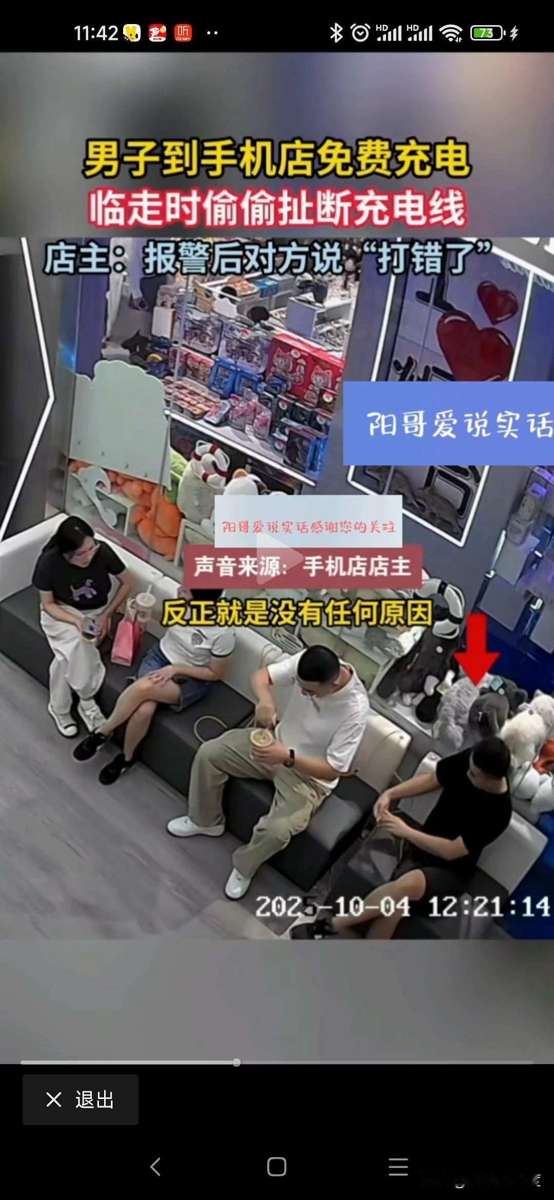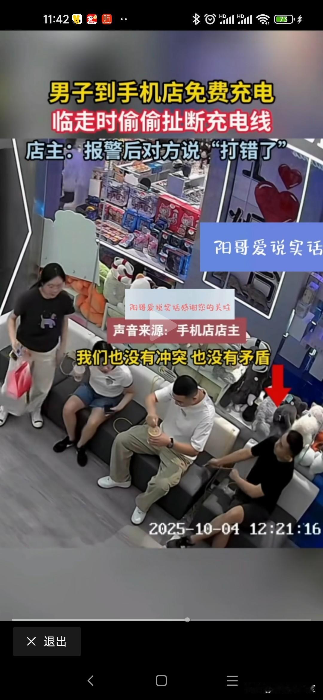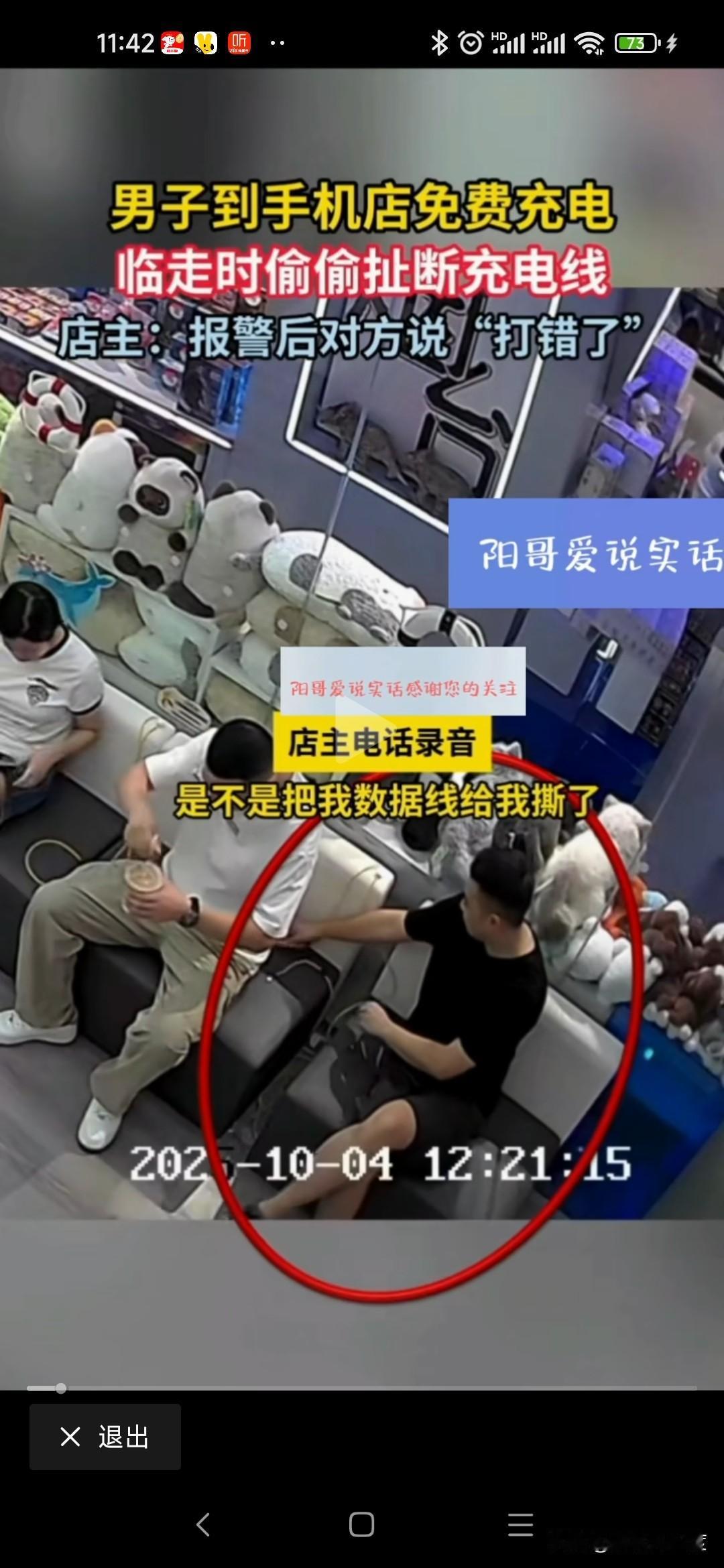 哈尔滨男子手撕充电线缘由 哈尔滨两男两女到烟台旅游,在万达广场某手机维修店免费手机充电半个小时。 只因手机店主从维修间出来的时候,看到吧台椅碍事,就用脚踢到桌子下面。 黑衣男子认为店主踹凳子吓到他,故而怀恨在心,走动观察店主不注意后,坐在沙发上把数据线扯断。 手机店主发视频到网上,第一次联系到黑衣男子,男子矢口否认说打错了。 视频在网络不断发酵,黑衣男子同行男女劝他主动道歉,男子迫于舆论压力打电话联系手机店主,并要求删除视频以及视频中另外三人! 黑衣男子说自己为什么撕数据线就因为手机店主踹凳子吓他一跳。 好怕怕,所以怀恨在心撕数据线报复,然后一口一个老爷们一人做事一人当的劲,要求店主是因为踹凳子吓到他,才撕的数据线。 店主问他如果没有视频是不是就不承认道歉,黑衣男子无语。 这是男人办的事吗?什么玩意,好心免费给你充电,还落了不是! 这男人如同老人摔倒反而讹诈好人的老人,我认为警方必须严肃处理,而不应该因为金额小而不处理!