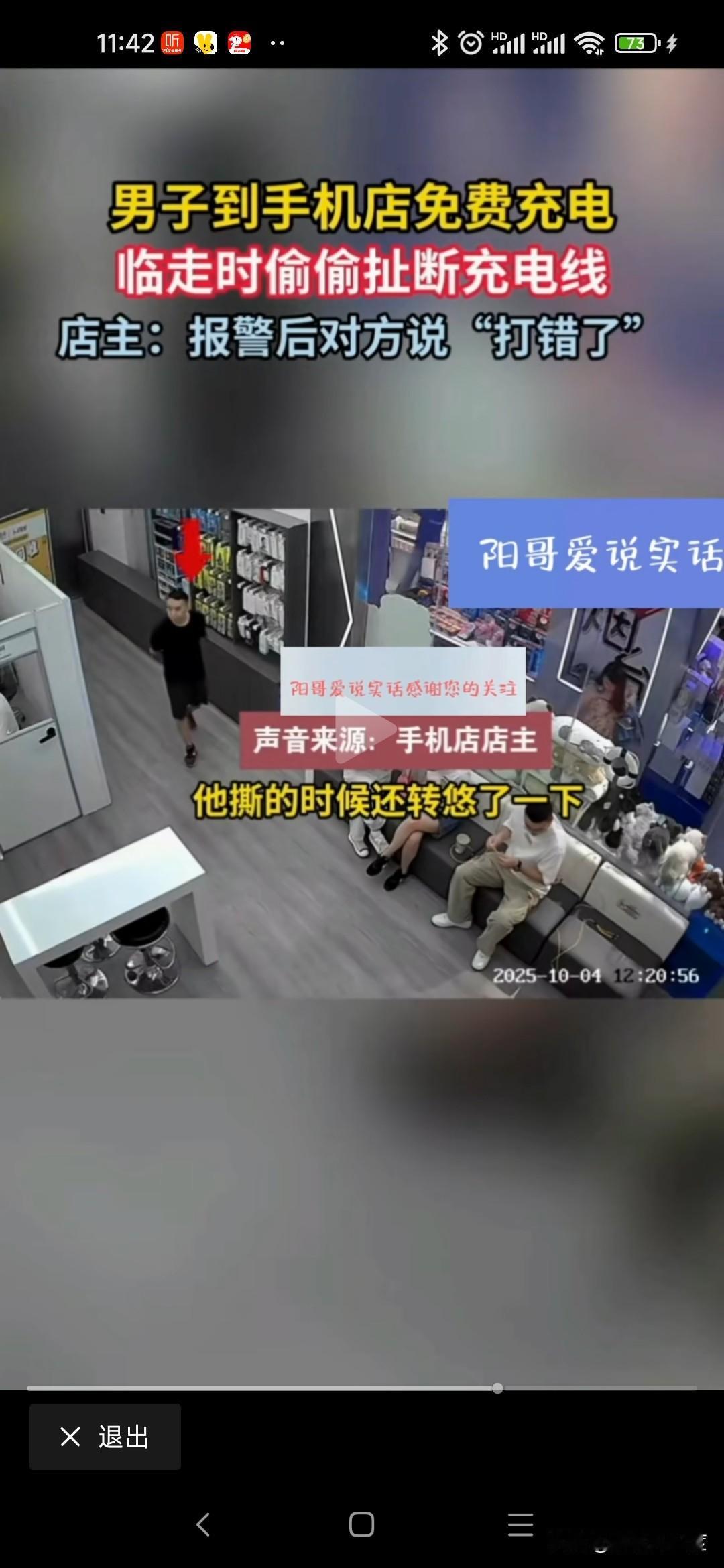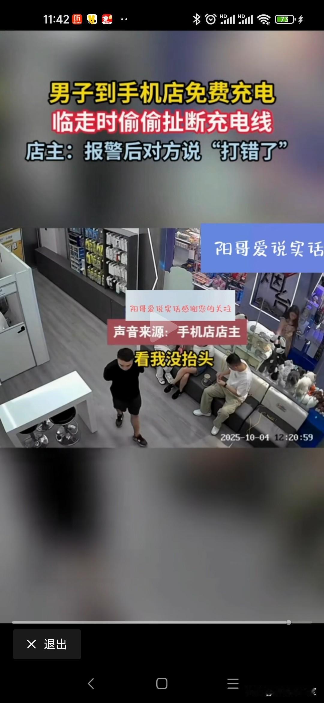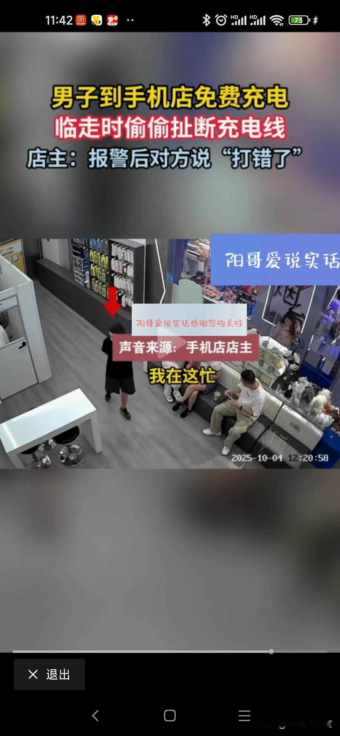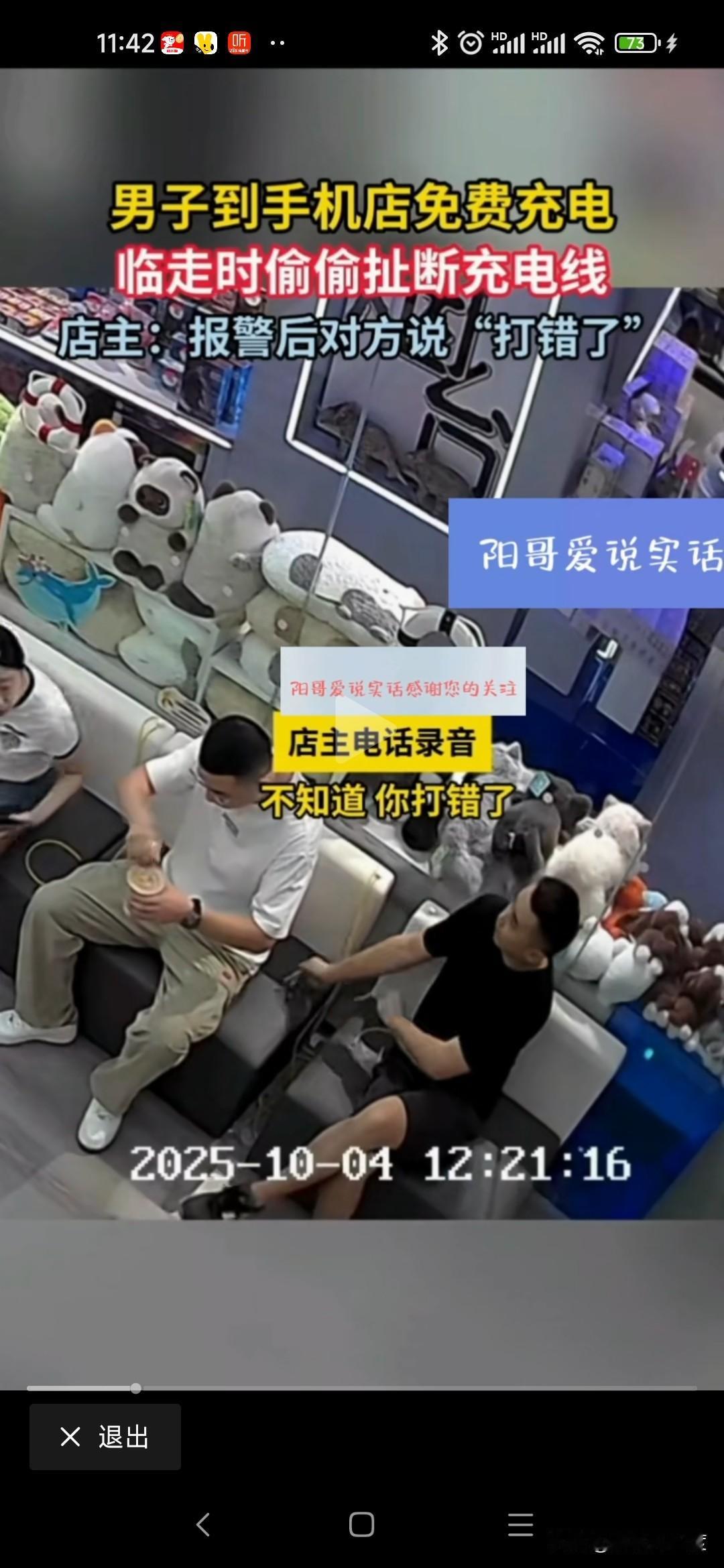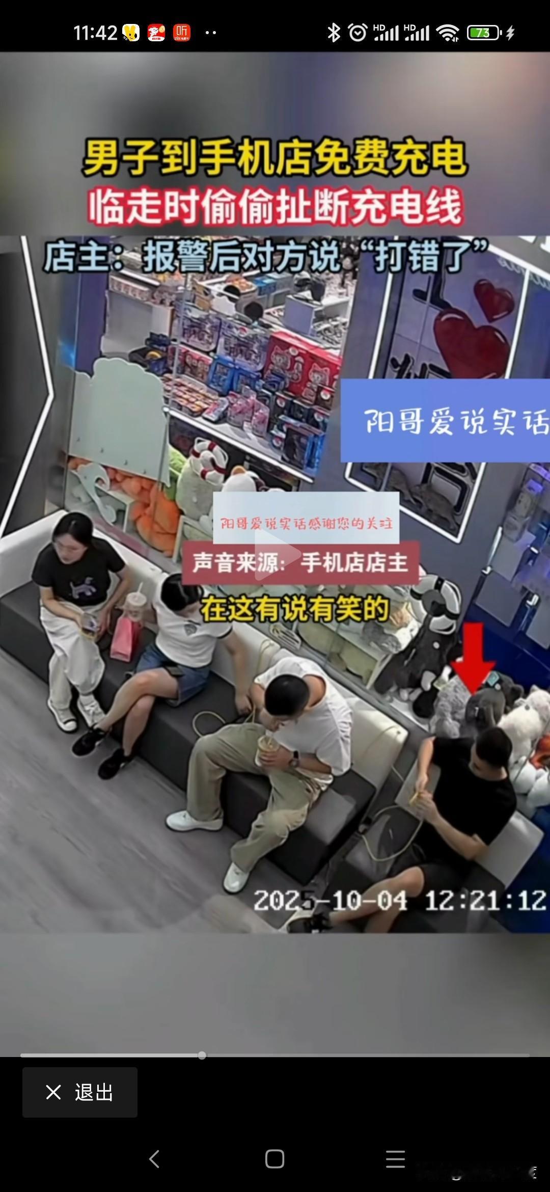 哈尔滨男子手撕充电线缘由 哈尔滨两男两女到烟台旅游,在万达广场某手机维修店免费手机充电半个小时。 只因手机店主从维修间出来的时候,看到吧台椅碍事,就用脚踢到桌子下面。 黑衣男子认为店主踹凳子吓到他,故而怀恨在心,走动观察店主不注意后,坐在沙发上把数据线扯断。 手机店主发视频到网上,第一次联系到黑衣男子,男子矢口否认说打错了。 视频在网络不断发酵,黑衣男子同行男女劝他主动道歉,男子迫于舆论压力打电话联系手机店主,并要求删除视频以及视频中另外三人! 黑衣男子说自己为什么撕数据线就因为手机店主踹凳子吓他一跳。 好怕怕,所以怀恨在心撕数据线报复,然后一口一个老爷们一人做事一人当的劲,要求店主是因为踹凳子吓到他,才撕的数据线。 店主问他如果没有视频是不是就不承认道歉,黑衣男子无语。 这是男人办的事吗?什么玩意,好心免费给你充电,还落了不是! 这男人如同老人摔倒反而讹诈好人的老人,我认为警方必须严肃处理,而不应该因为金额小而不处理!