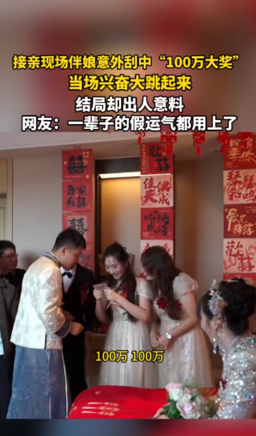 近日,一位伴娘在接亲现场玩刮刮乐游戏时,竟然意外刮出了一个“100万元”的一等奖