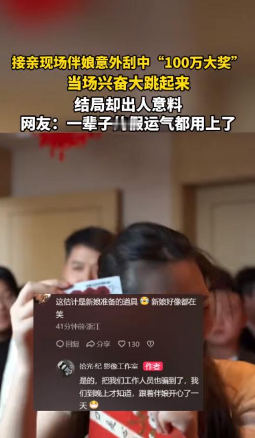 近日,一位伴娘在接亲现场玩刮刮乐游戏时,竟然意外刮出了一个“100万元”的一等奖大奖,伴娘为此激动不已,谁知新娘一句话却让伴娘当场傻眼!网友:这就是人生的大起大落啊。   据新视界10月8日报道,河北,一处民居里满是接亲的热闹劲儿,红气球挂在门框上,彩带飘落在沙发角,伴郎伴娘围着新郎新娘起哄,屋里的笑声几乎要掀翻屋顶。   按照当下不少人的结婚习惯,新人早早就准备了刮刮乐,想靠这个环节再添点喜气,只是没人想到,这场原本图个乐的互动,会闹出这么一段起伏。   新娘从包里拿出一沓刮刮乐分给伴郎伴娘,轮到其中一位伴娘时,她笑着接过,指尖慢慢刮开上面的银漆。   一开始没什么特别,直到最后一层银漆被刮掉,“100万元”三个大字赫然在目,还标注着“一等奖”。   伴娘愣了一下,盯着彩票上的数字看了又看,确认了一遍又一遍,才猛地反应过来,自己好像中大奖了!   这位伴娘不管身上穿着的伴娘服会不会走样,抬手就挥舞着彩票跳了起来,嘴里还不停喊着“太爽了”,声音里满是激动。   她甚至特意走到婚庆团队的摄像机前,把彩票凑过去让镜头拍清楚,手因为太兴奋一直在抖,说话也变得结结巴巴。   走到新娘身边时,她还一个劲儿道谢,说自己沾了新娘的福气,才能有这么好的运气。 周围的人也跟着高兴,伴郎们拍着手叫好,有人还说“这伴娘真是天选锦鲤”,连负责婚礼摄影的工作人员都举着相机猛拍,生怕错过这个热闹瞬间。   可就在大家都沉浸在这份喜悦里时,新娘突然拍了拍伴娘的肩膀,笑着说:“傻丫头,那是我从网上买的道具彩票,没法兑奖的。”   这句话像一盆冷水,瞬间浇灭了现场的热闹。   原本嘈杂的屋子一下子静了下来,伴娘举着彩票的手僵在半空,脸上的笑容也慢慢垮了下来,变得有些苦涩。   其实婚礼上搞点互动本是好事,可这种没提前跟人说清楚的玩笑,难免会让人从高兴的顶峰掉下来,心里不是滋味。   就像这位伴娘,一开始还以为能靠这100万改变点什么,结果却是一场假惊喜,换谁心里都会有落差。   更有意思的是,不光伴娘信了,连婚庆团队的人当天都没看出破绽。   道具彩票做得太逼真,他们一直以为是真的刮刮乐,直到晚上跟新人聊天时,才知道那是假的。 今天的分享到这里就结束了,大家对此事有何看法,欢迎在评论区留言和讨论,感兴趣的可以点击头像加关注,我将每日更新优质内容,我们下期见。 信源:   原文登载于新视界2025年10月08日关于《伴娘在接亲时玩道具刮刮乐中奖,新娘在一旁早已看穿一切》的报道